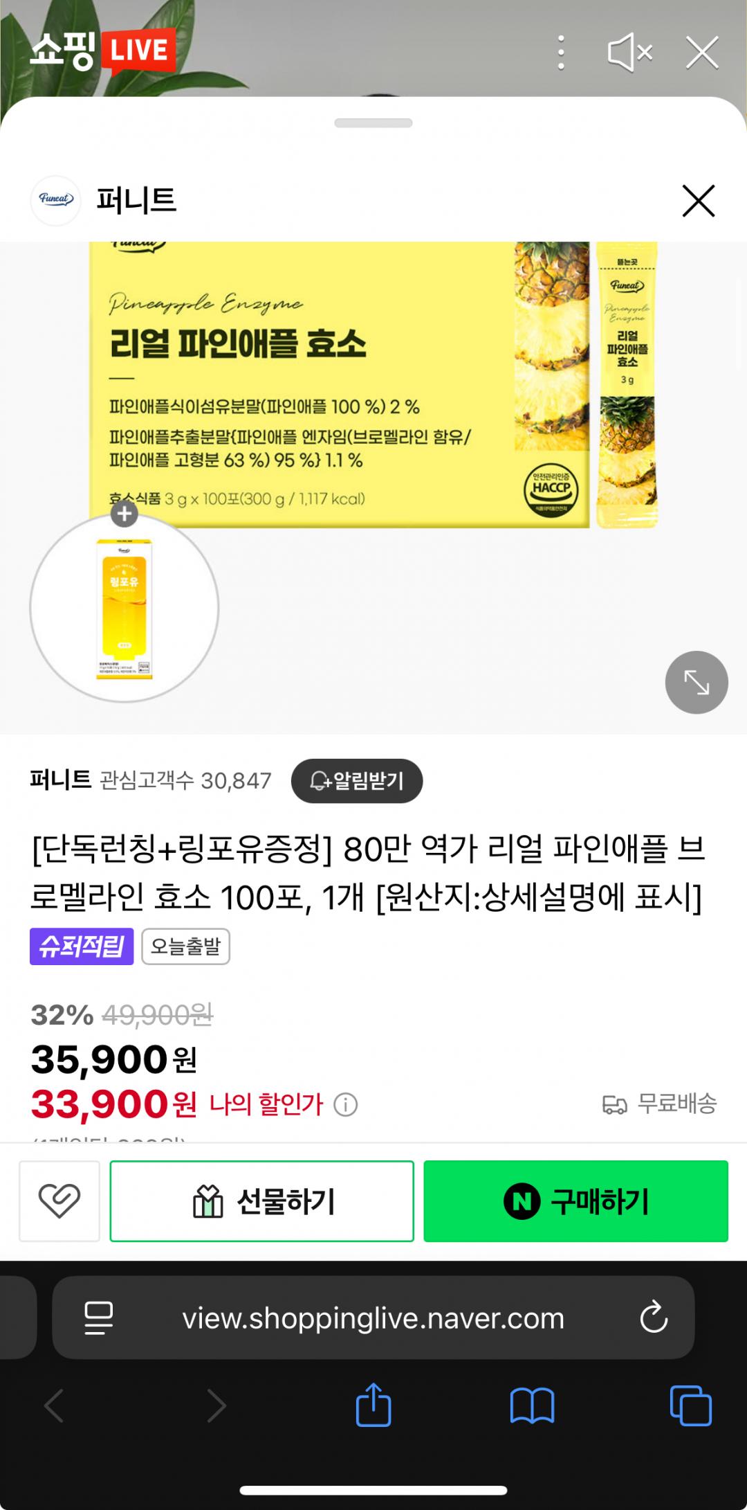[네이버라방] 퍼니트 리얼파인애플효소 대용량 100포(35900/무배)