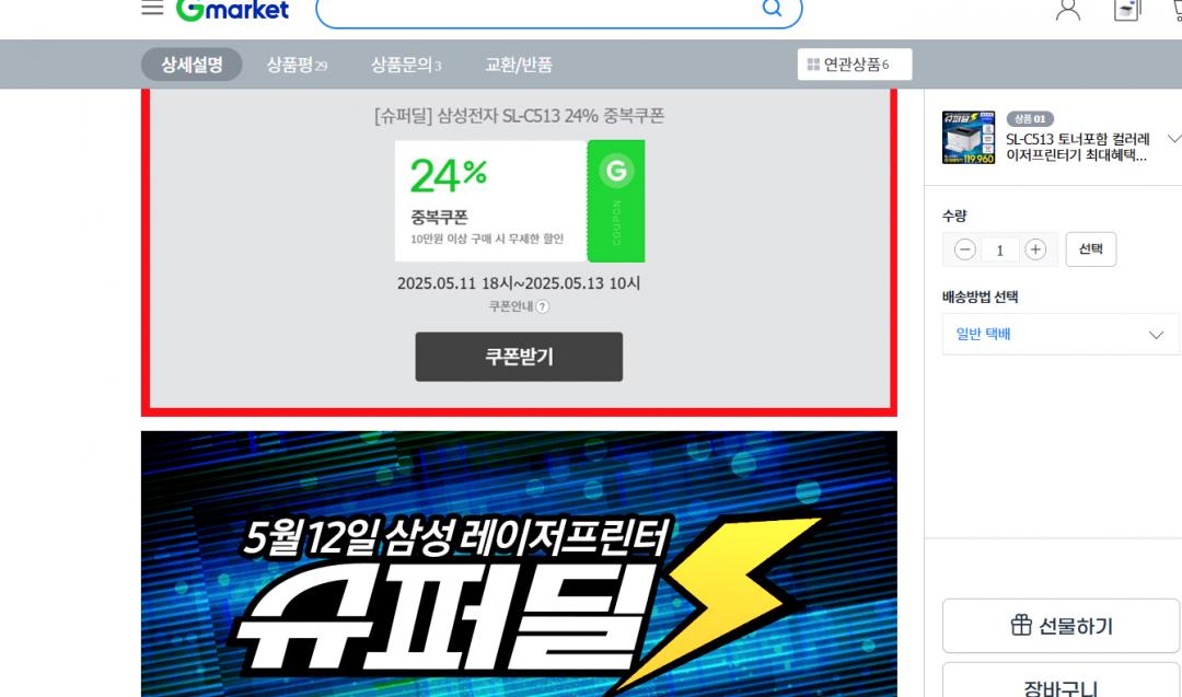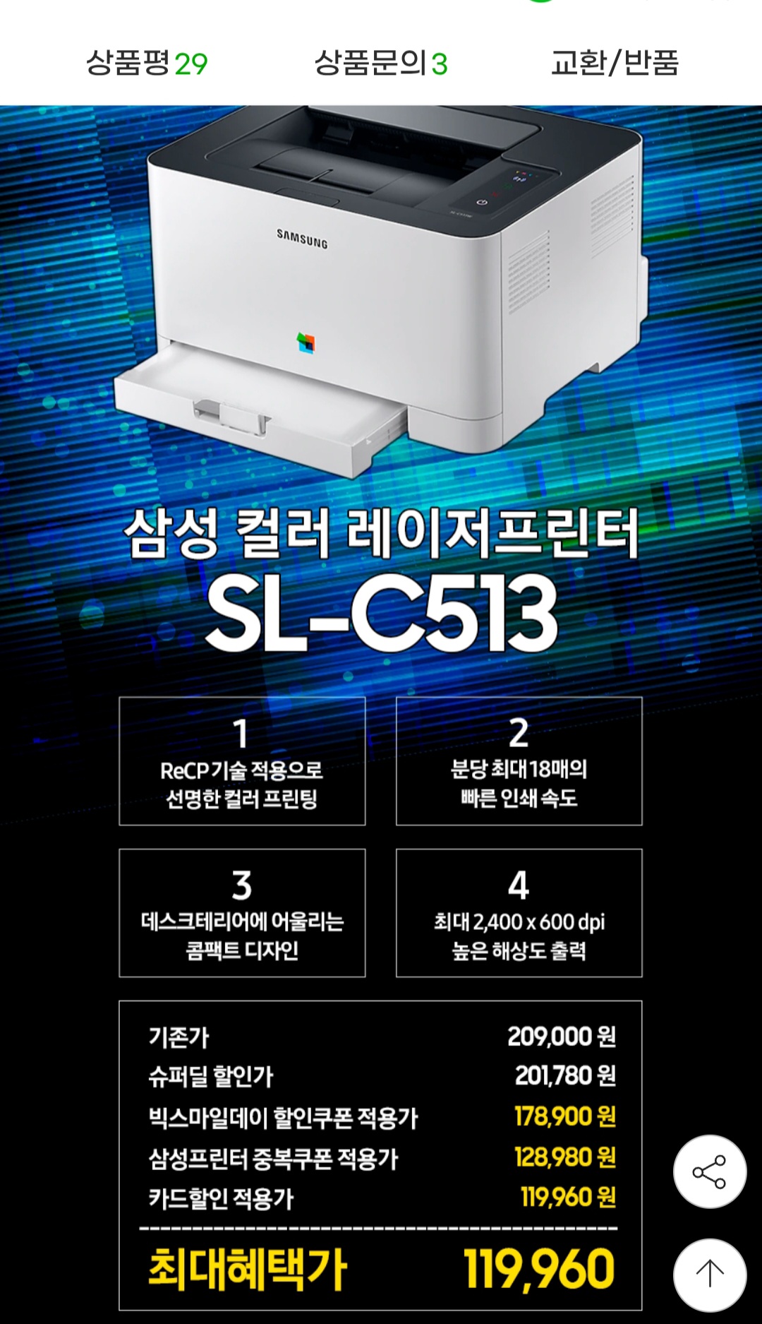 [G마켓] 삼성전자 SL-C513 컬러레이저프린터 (119,960원/무배) > 국내핫딜