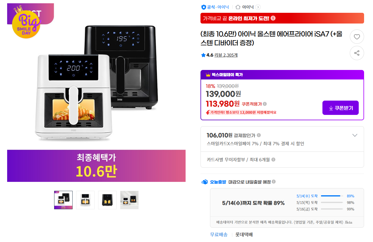 [G마켓] 아이닉 올스텐 에어프라이어 iSA7 (106,010원 / 무료) > 국내핫딜