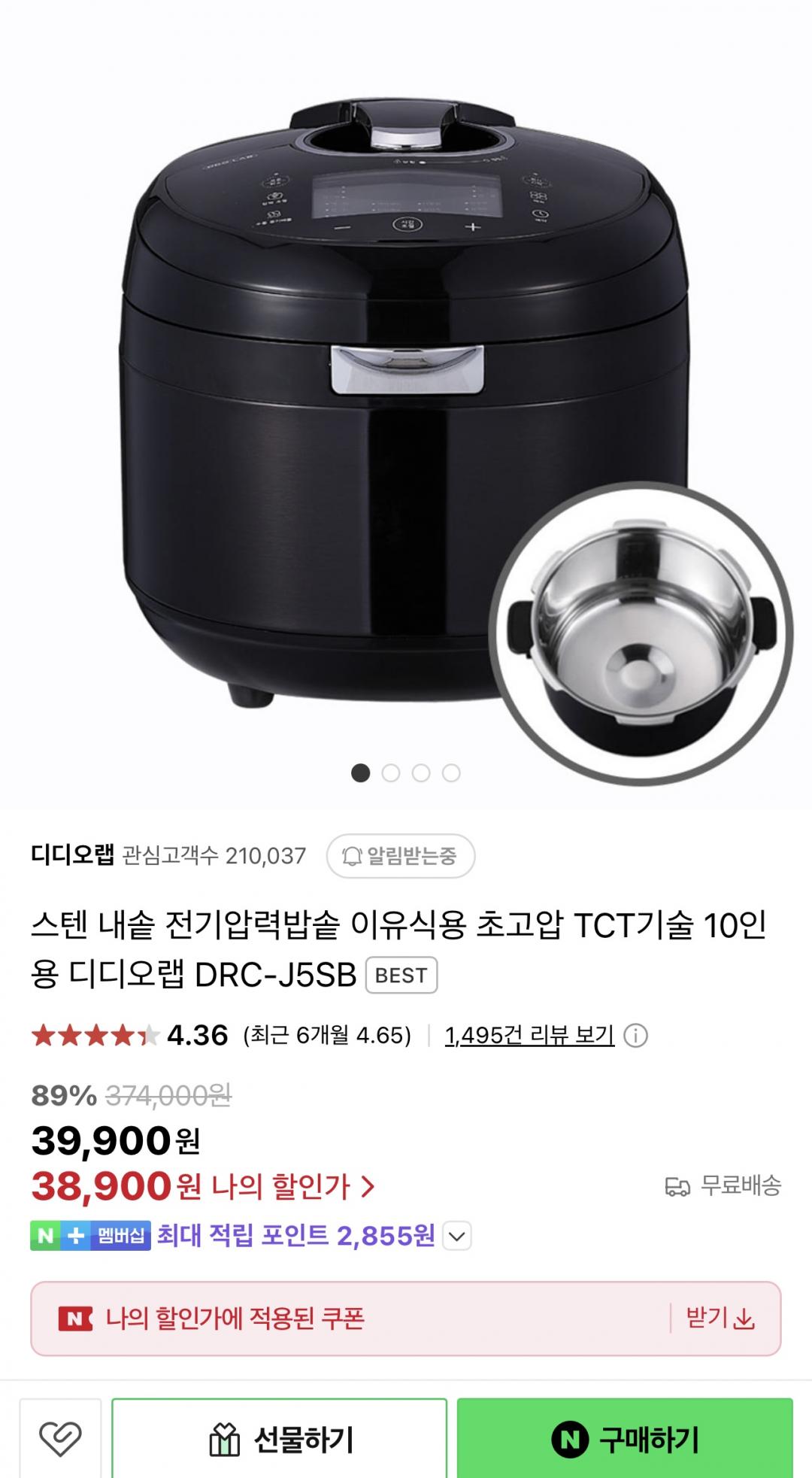 [네이버] 스텐 전기압력밥솥 10인용 (38,900원/무료)