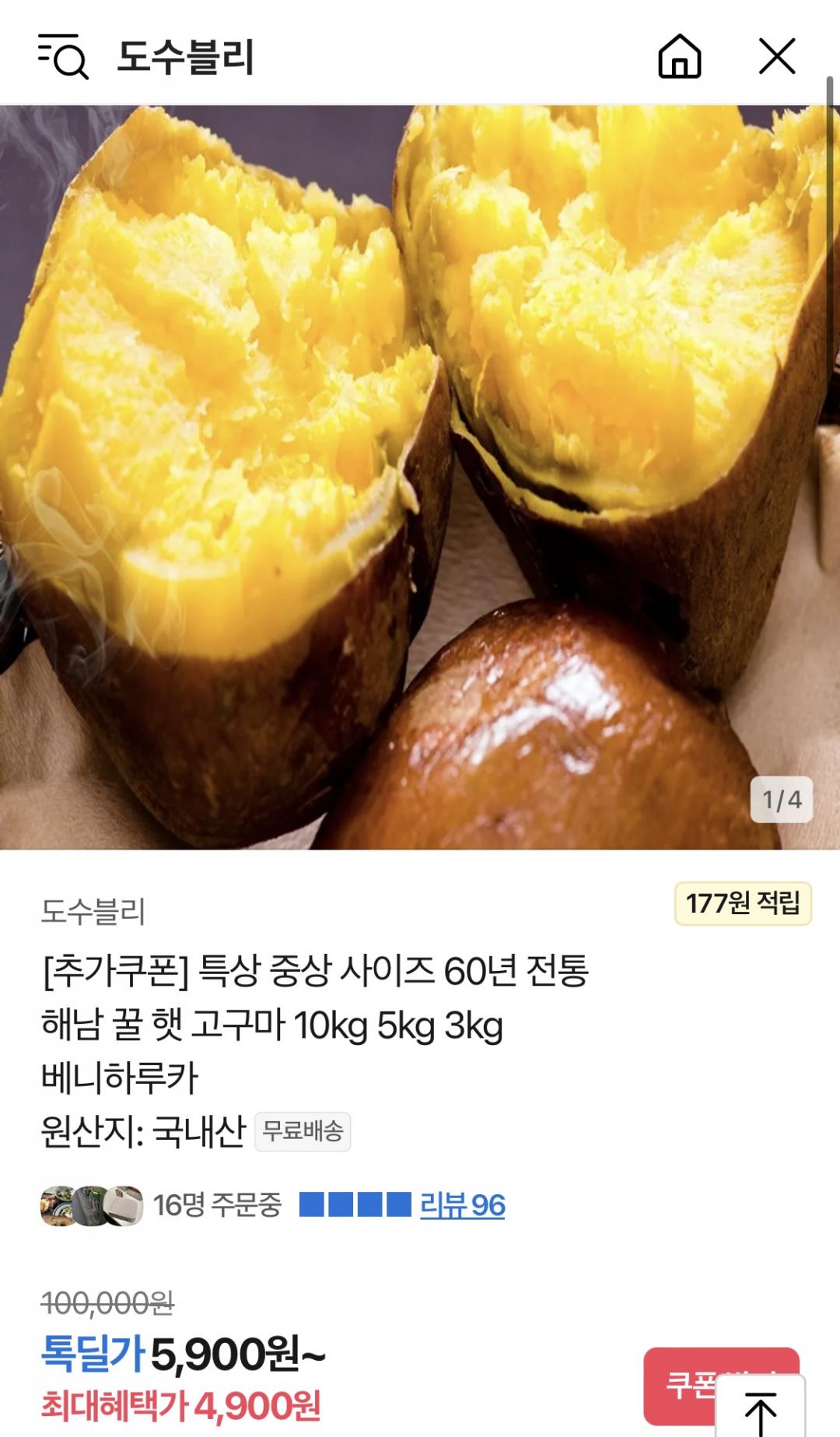 [카카오] 해남 베니하루카 꿀고구마 대왕2kg (4,900원/무료) > 국내핫딜