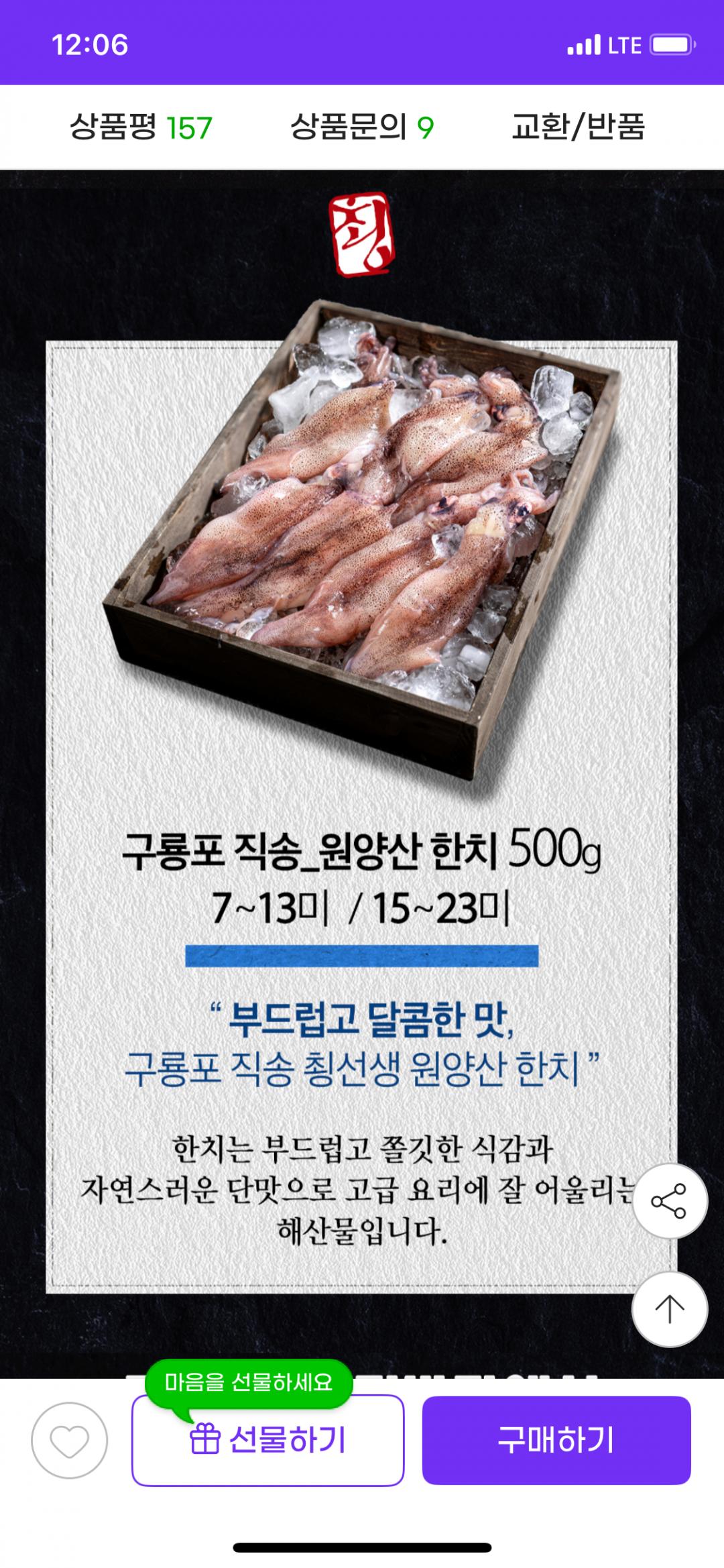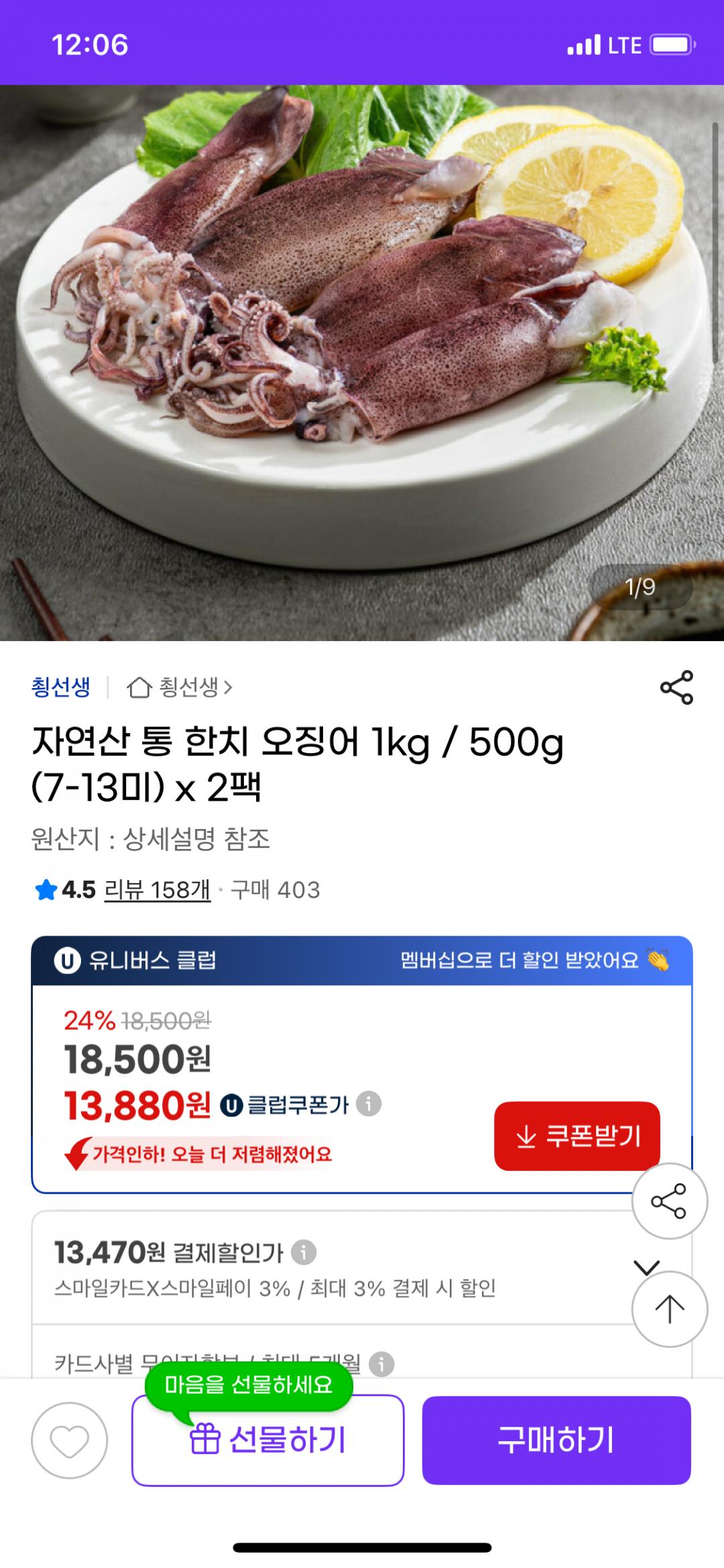 [지마켓] 자연산 통 한치 오징어 1kg (13470원/무배) > 국내핫딜
