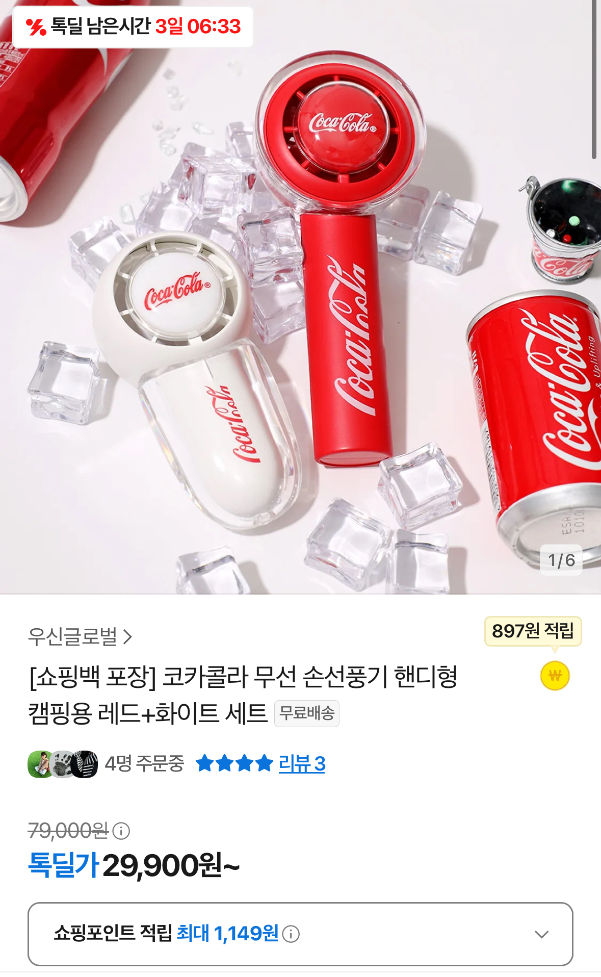 [톡딜] 코카콜라 무선 핸디형 손선풍기 레드+화이트 세트 1+1 (29,900원/무배) > 국내핫딜