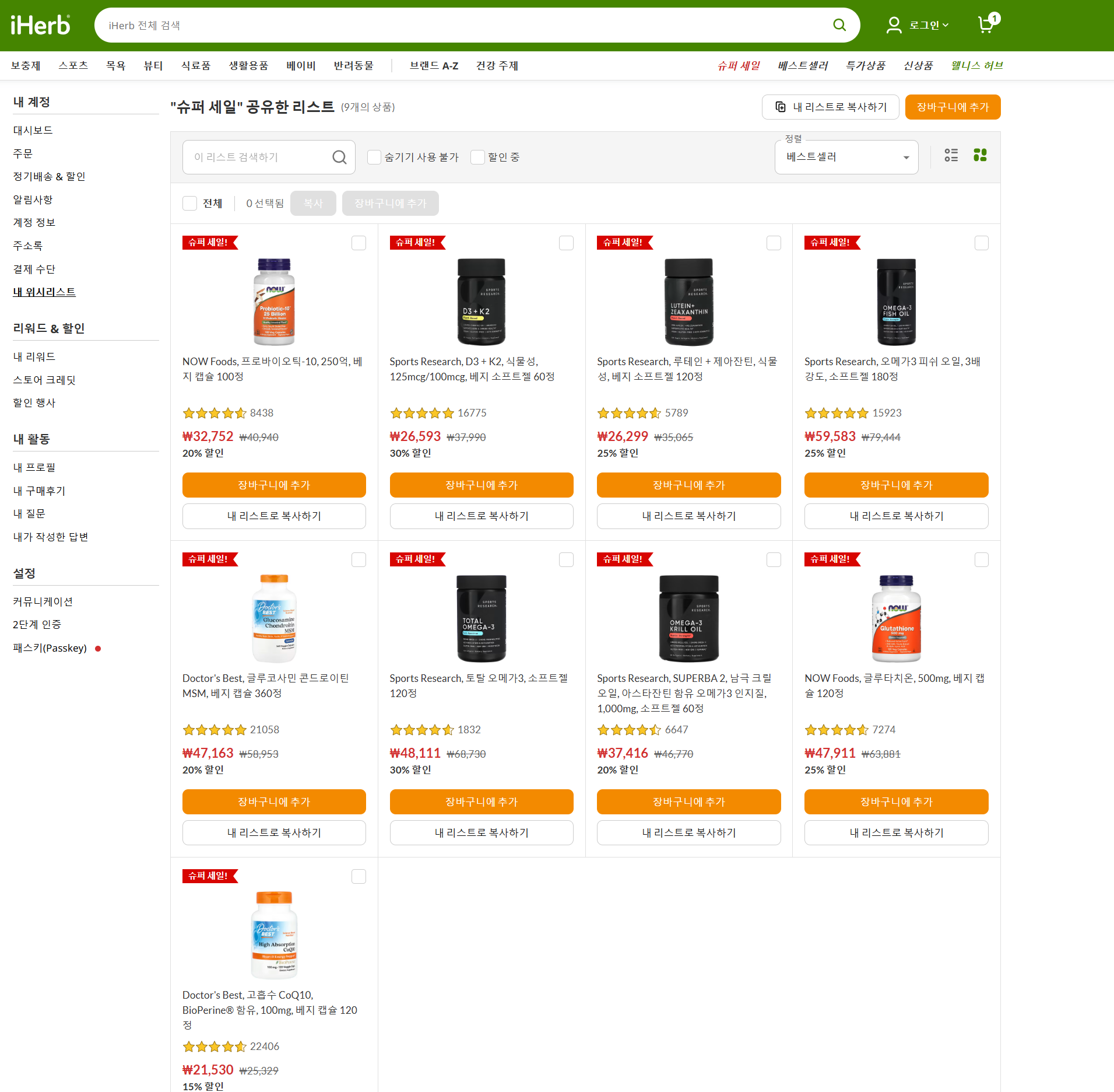 아이허브에서 스포츠리서치, 나우푸드, 닥터스베스트 등
