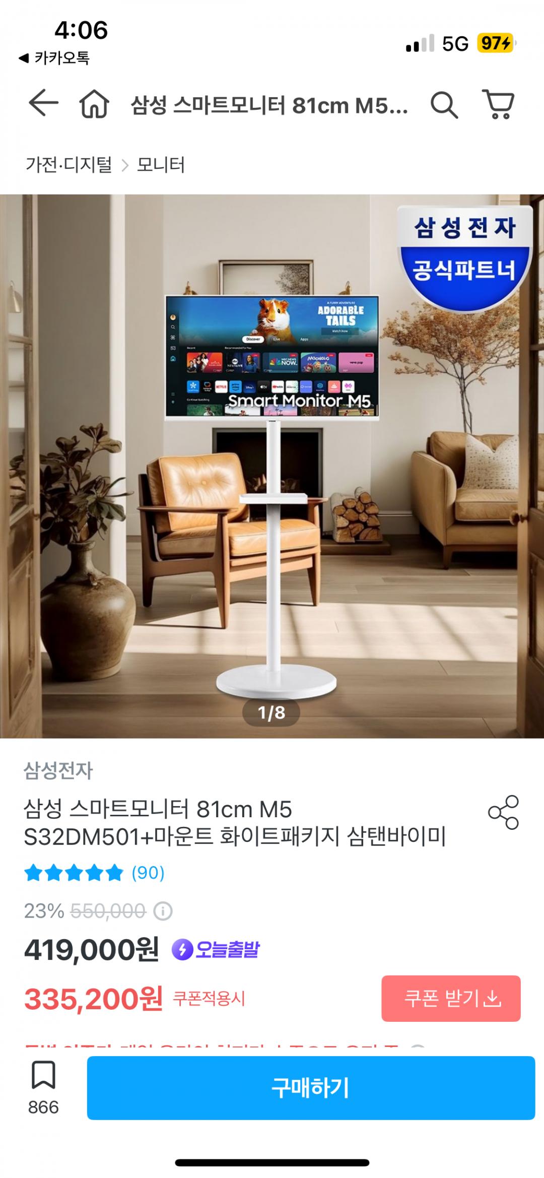 [오늘의 집] 삼성 스마트모니터 81cm M5 S32DM501+마운트 화이트패키지 삼탠바이미 (301,740원/무료)