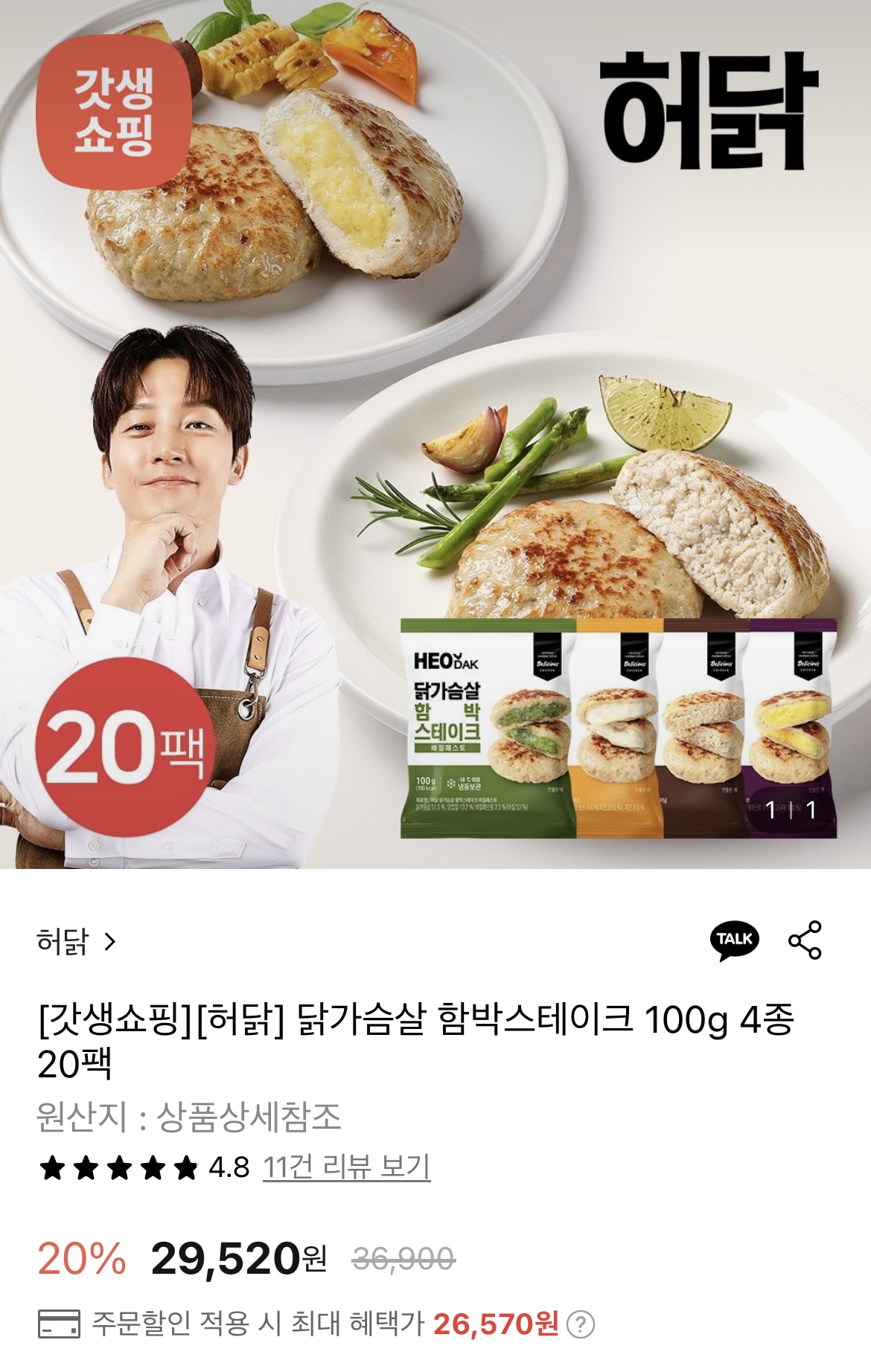 [롯데온] 닭가슴살 함박스테이크 오리지널 100g 20팩 (26,570원/무료) > 국내핫딜