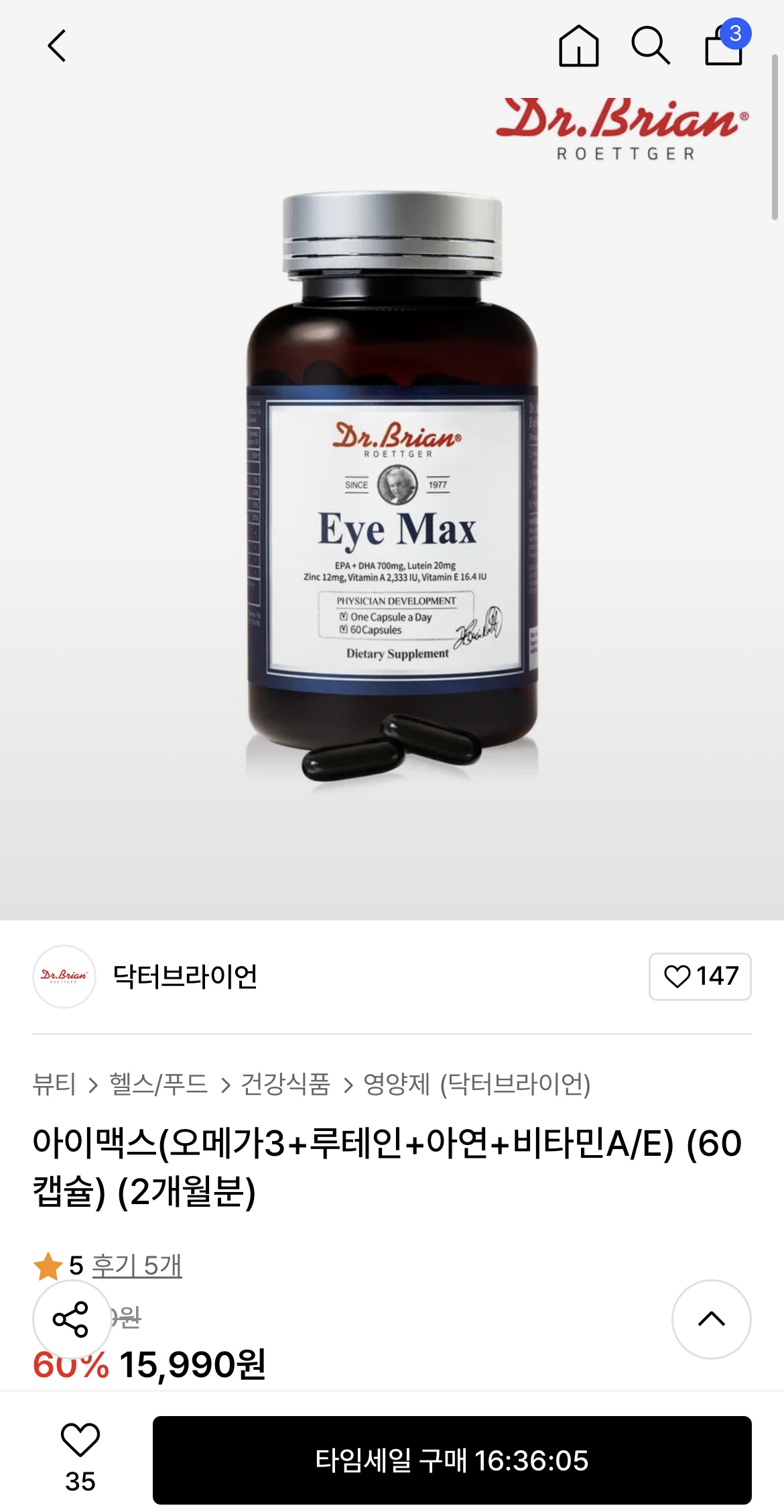 닥터브라이언 아이맥스 60캡슐짜리 1통이 15,990원이네요
