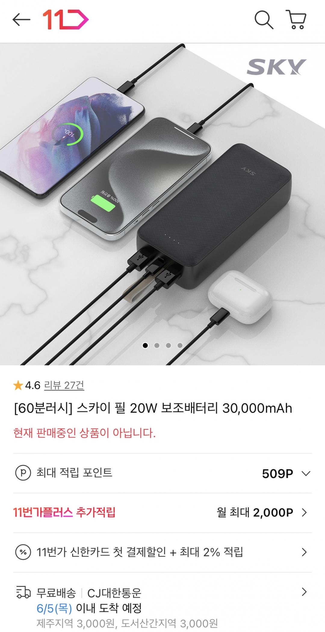 [11번가] 60분러시 스카이필 20W 30,000mAh 보조배터리 (16,990원/무료) > 국내핫딜