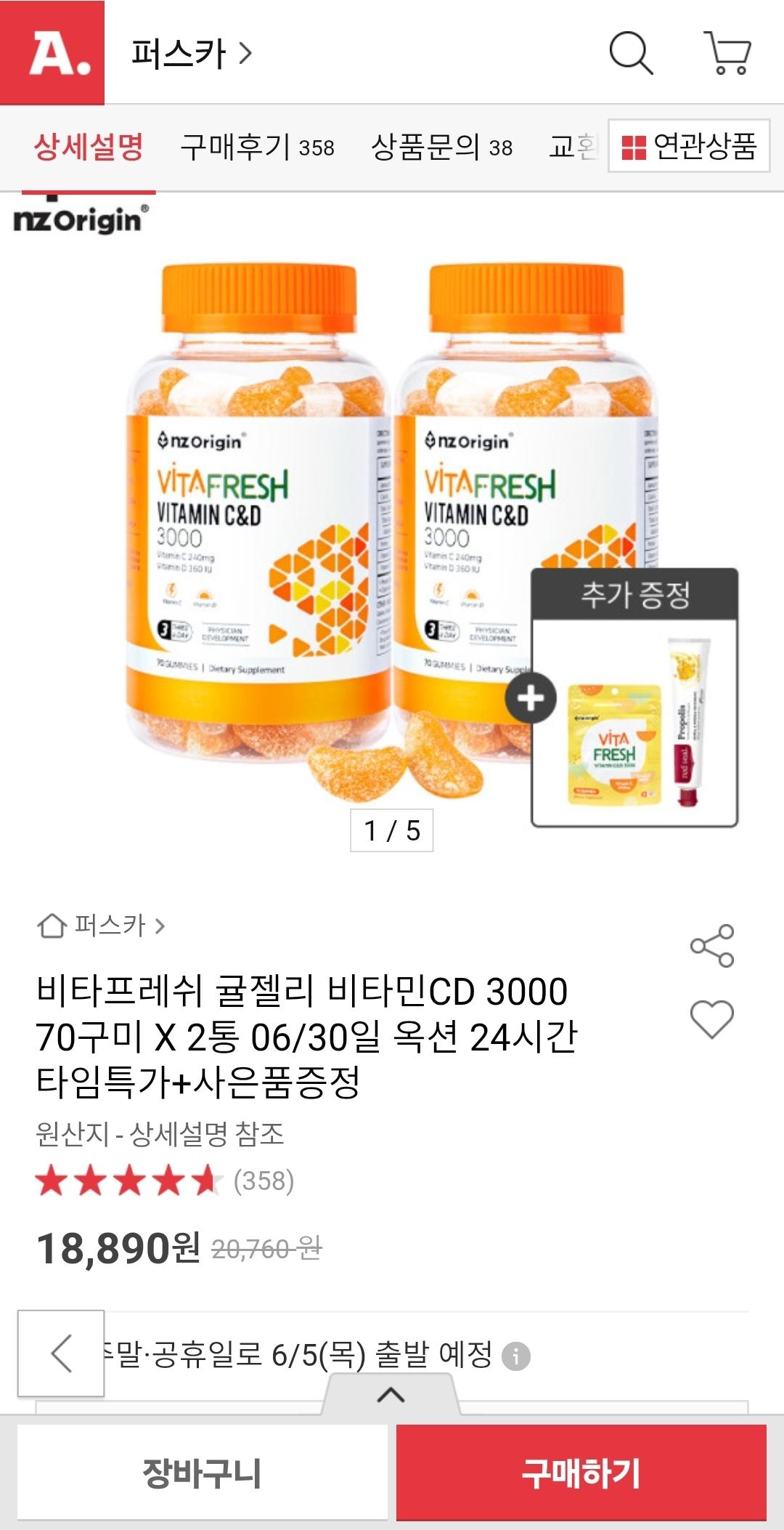 [옥션] 비타프레쉬 귤젤리 비타민CD 3000 100구미 2통 (18,890원/무료)