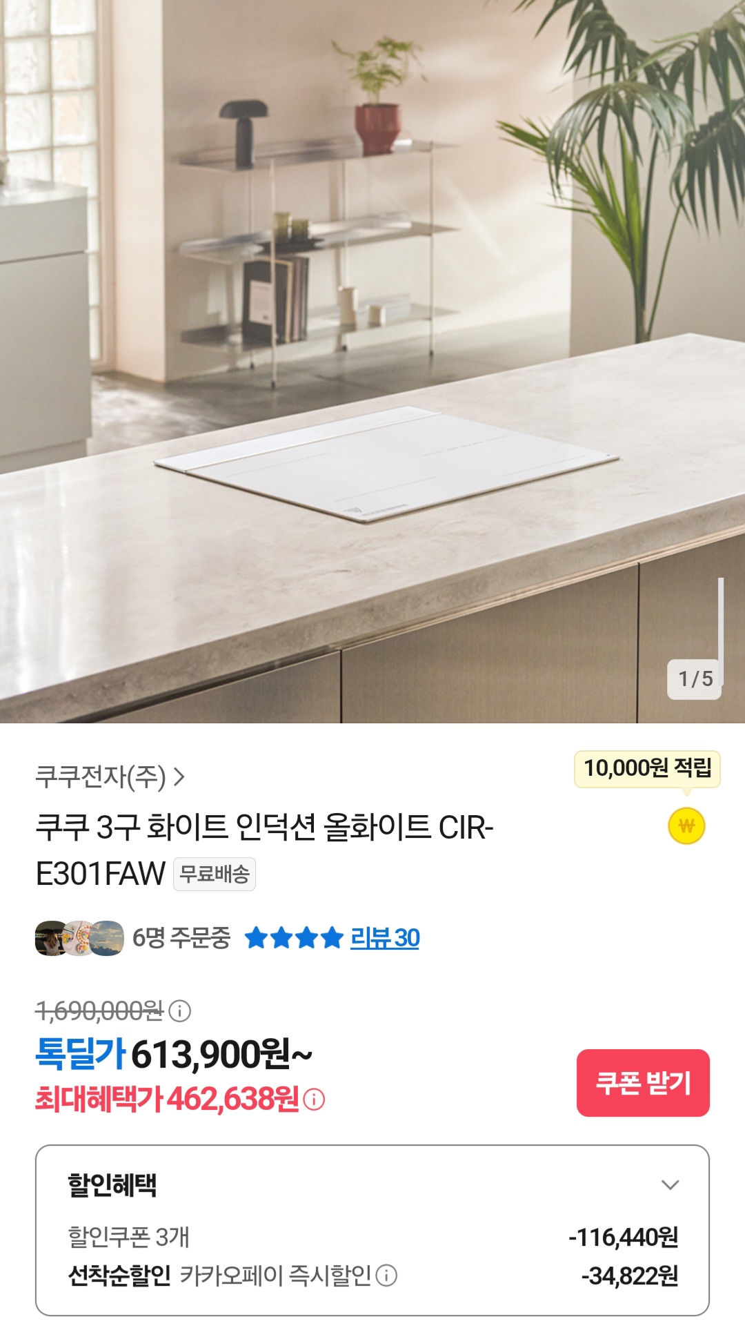 [카카오] 쿠쿠 3구 화이트 인덕션 (462,638원/ 무료)
