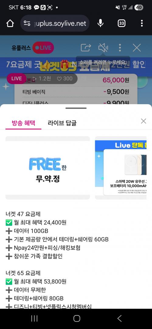 지금 라이브 통해서 너겟 47요금제 가입하면 보조배터리랑 12개월간 네이버 2만 포인트씩 줍니다.