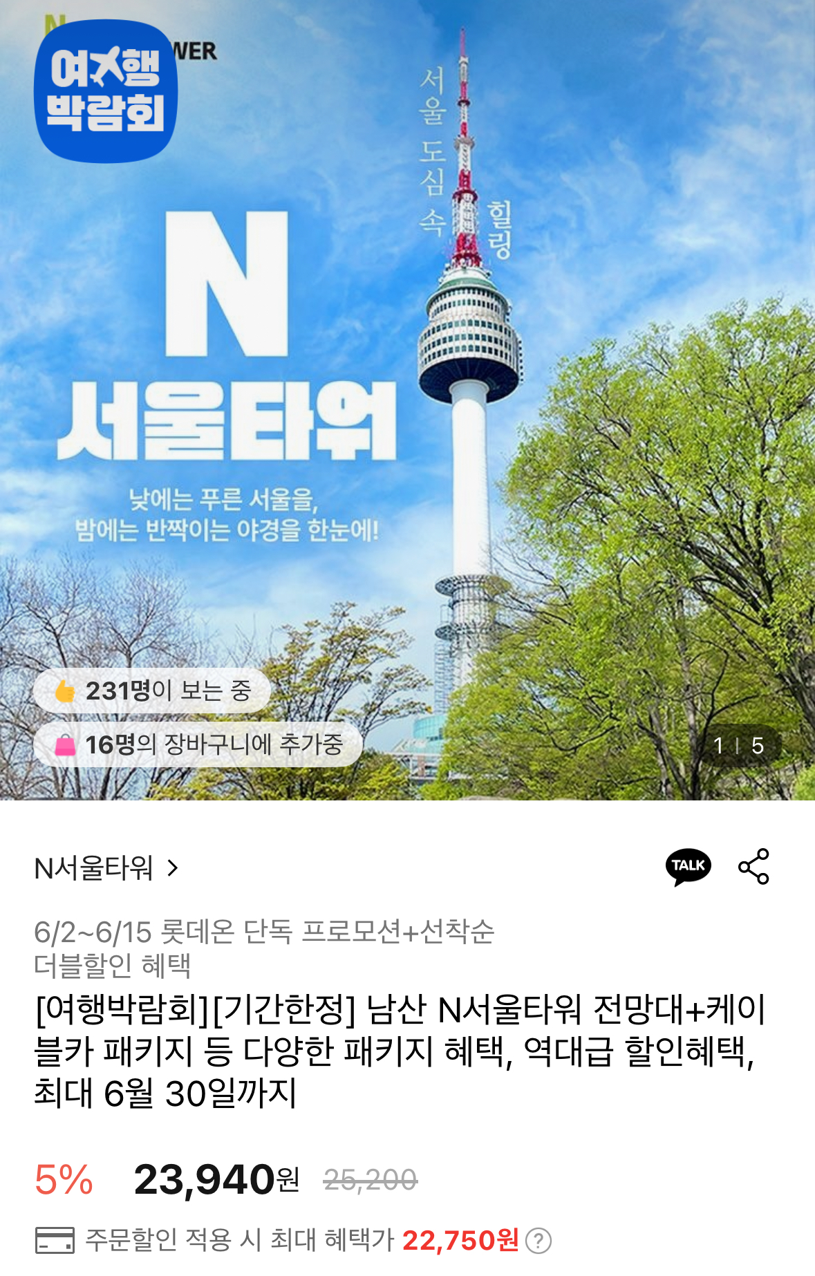 [롯데온] 남산 N서울타워 전망대+케이블카 패키지 (22,750원~/무료) > 국내핫딜