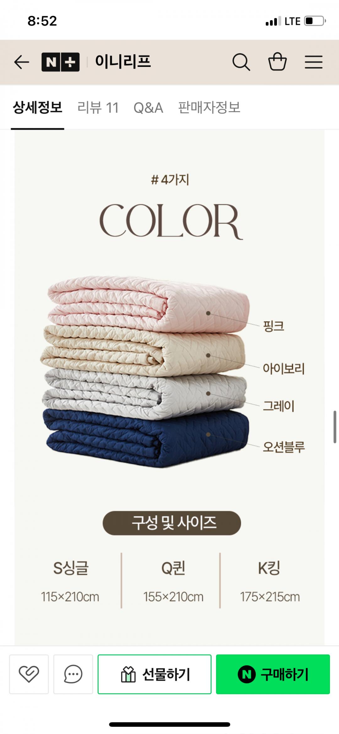 사이즈는 S, Q, K 있고 색상은 핑크, 아이보리, 그레이, 오션 블루 있어요