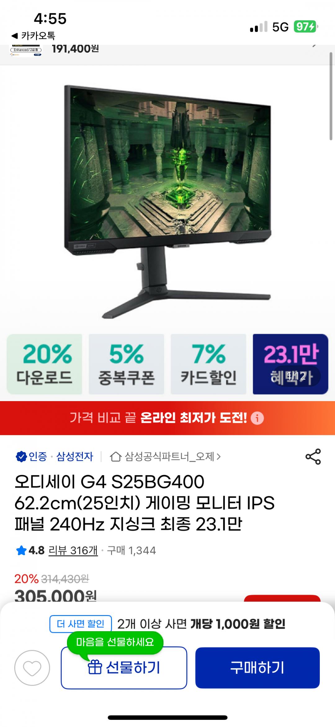 [g마켓] 오디세이 G4 S25BG40 (221,310원/무료)