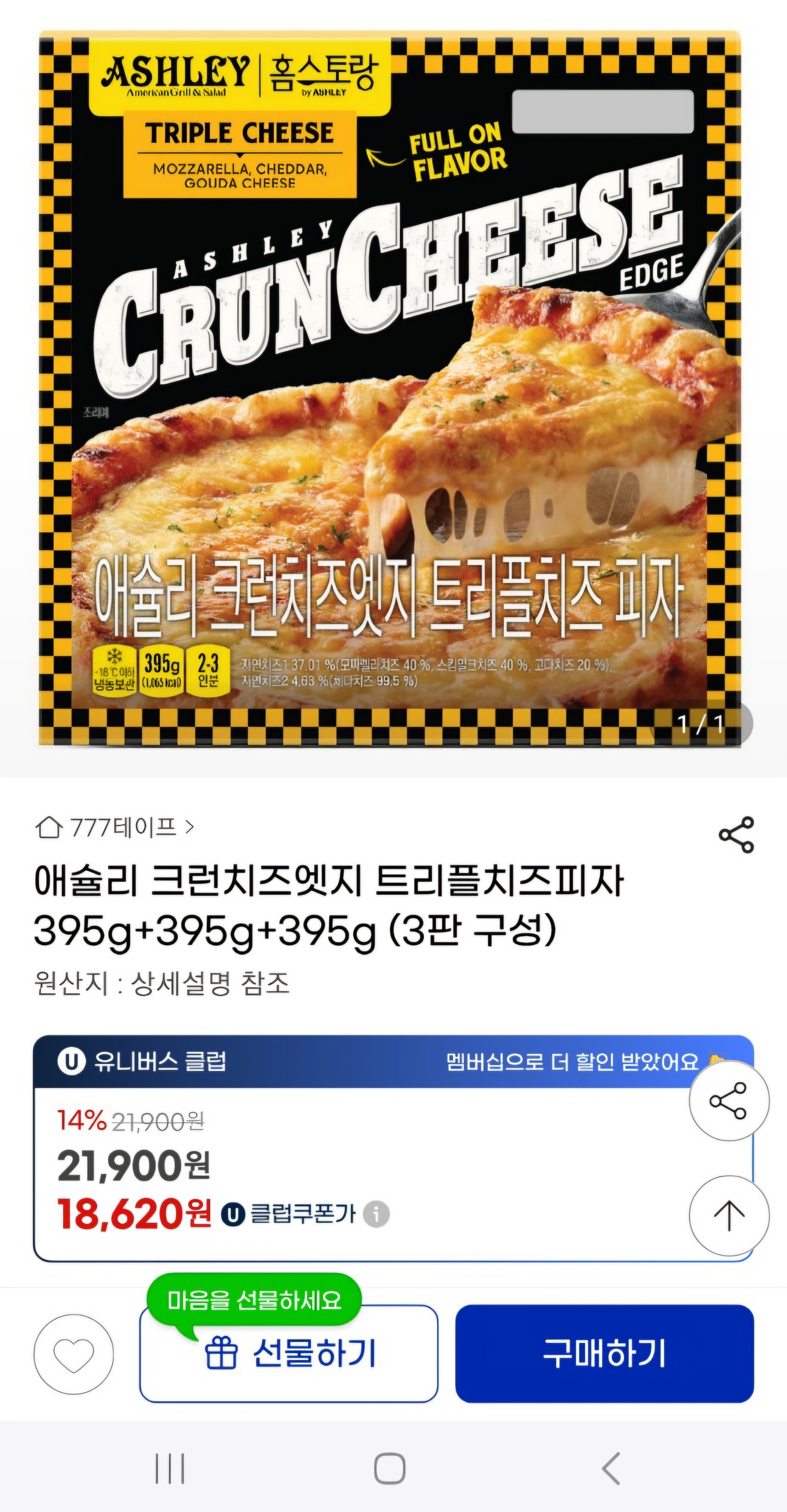 [G마켓]애슐리 크런치즈엣지 트리플치즈피자 3판 유클가 18,620원 > 국내핫딜