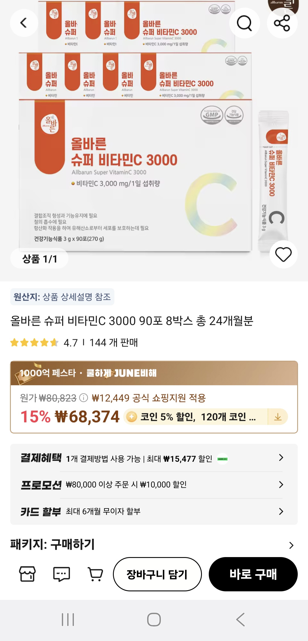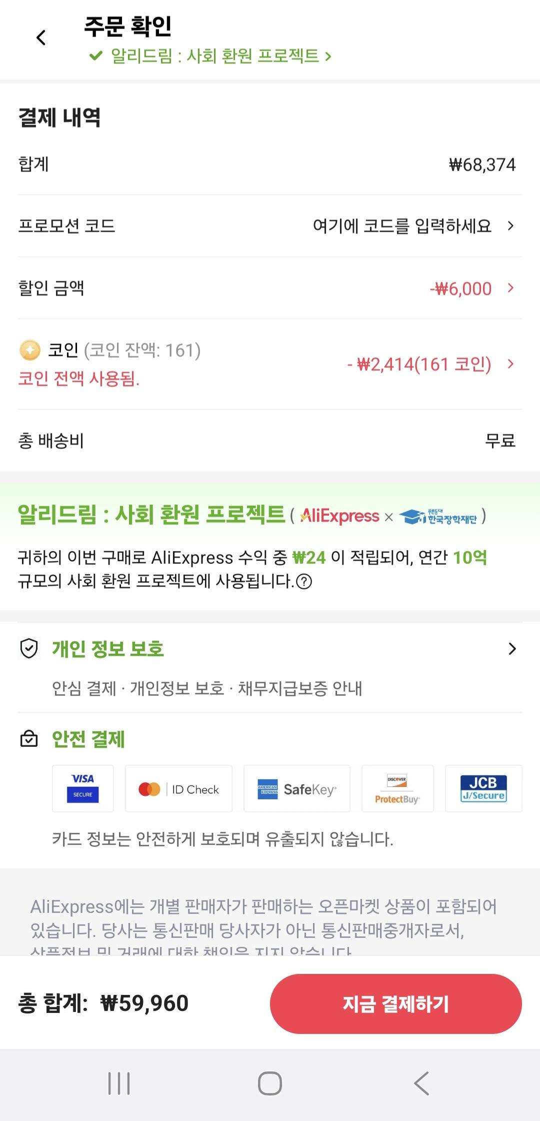 24개월분인데 59,960원 무료배송인데 알리 프로모션 쿠폰 6,000원 할인 + 코인할인 까지 받으면 위금액 나옵니다