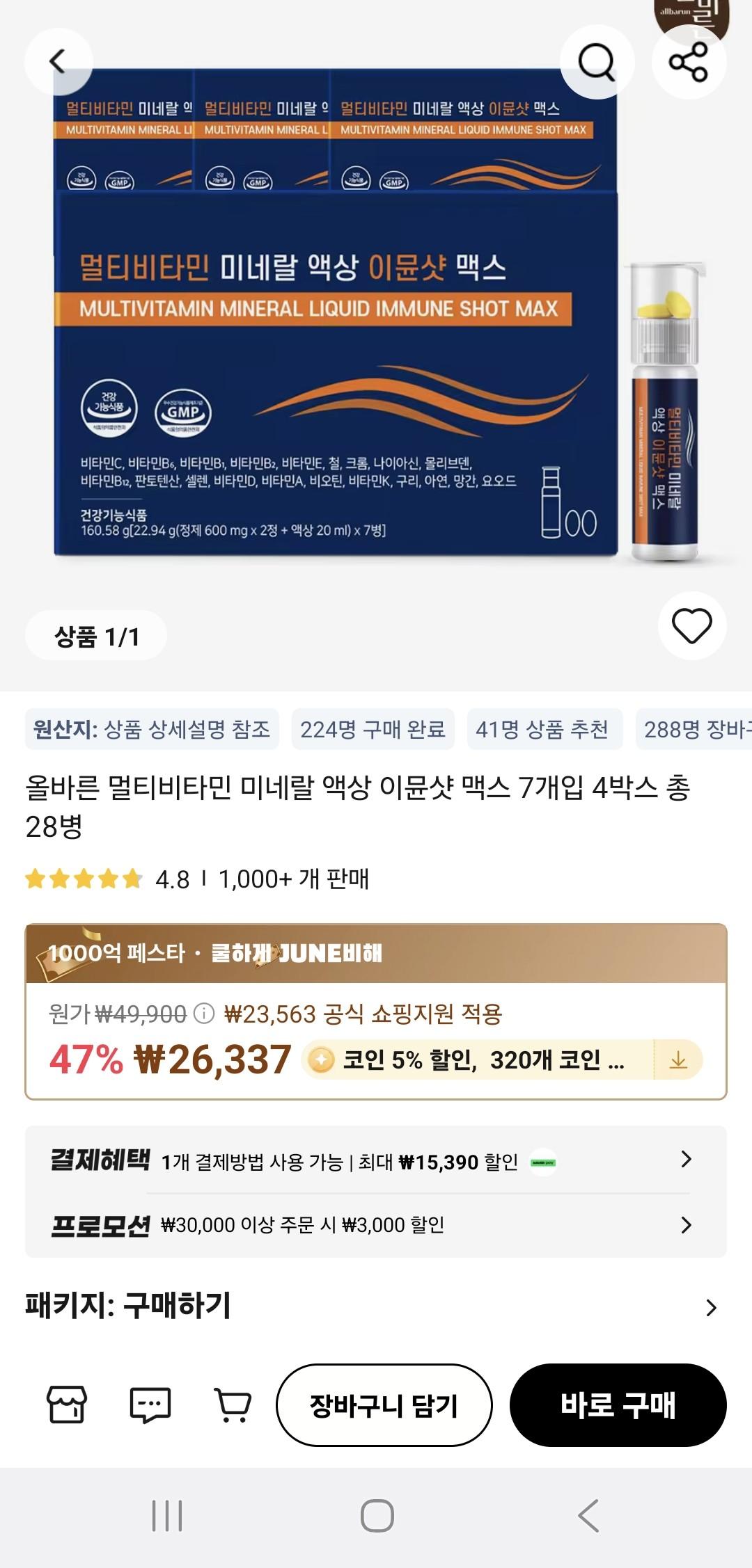 [알리] 올바른 멀티비타민 미네랄 액상 이뮨샷 맥스 7개입 4박스 총 28병 (25,020/무료)