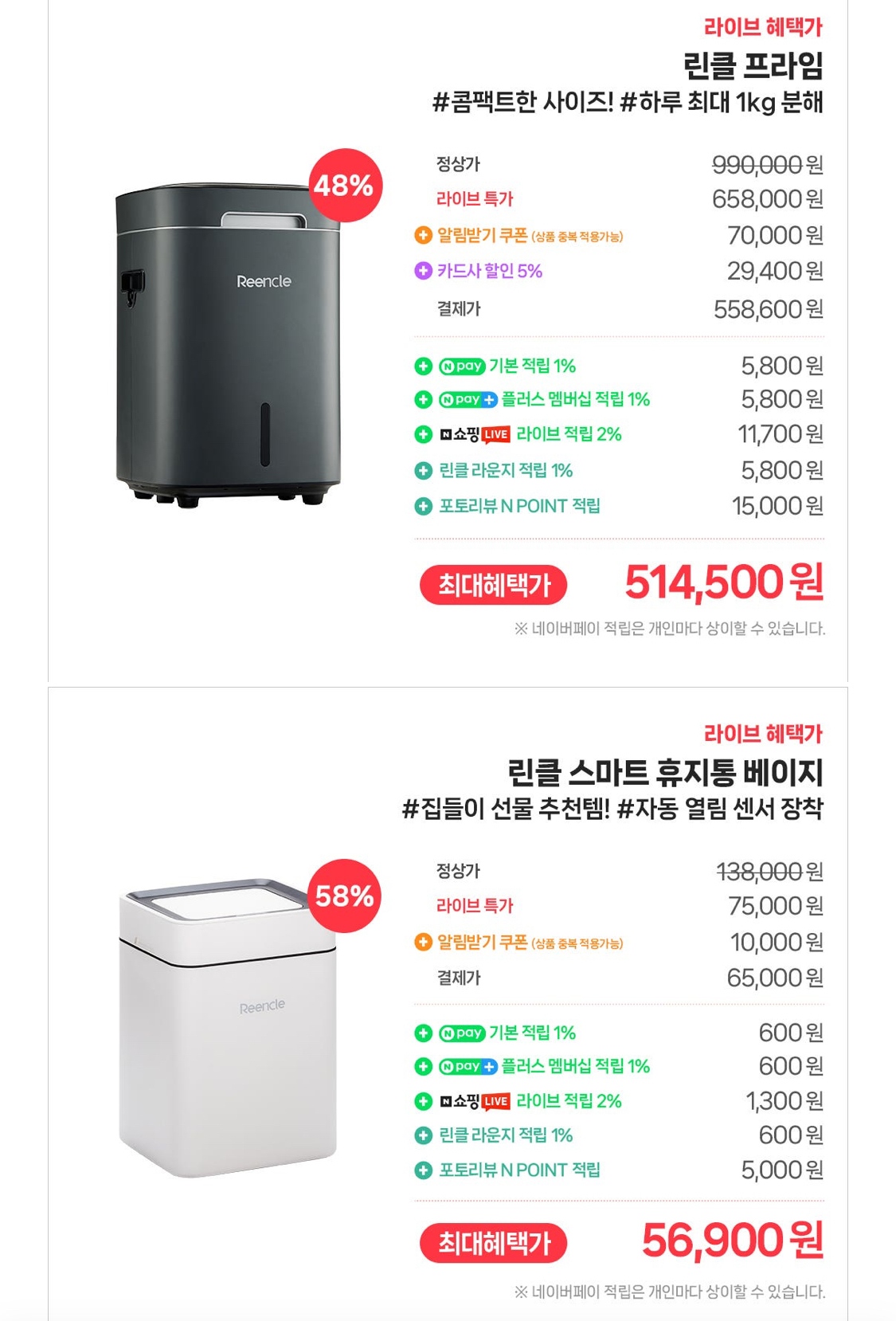 [네이버] 린클 음식물처리기 라이브 특가 (558,600원~/무배) > 국내핫딜
