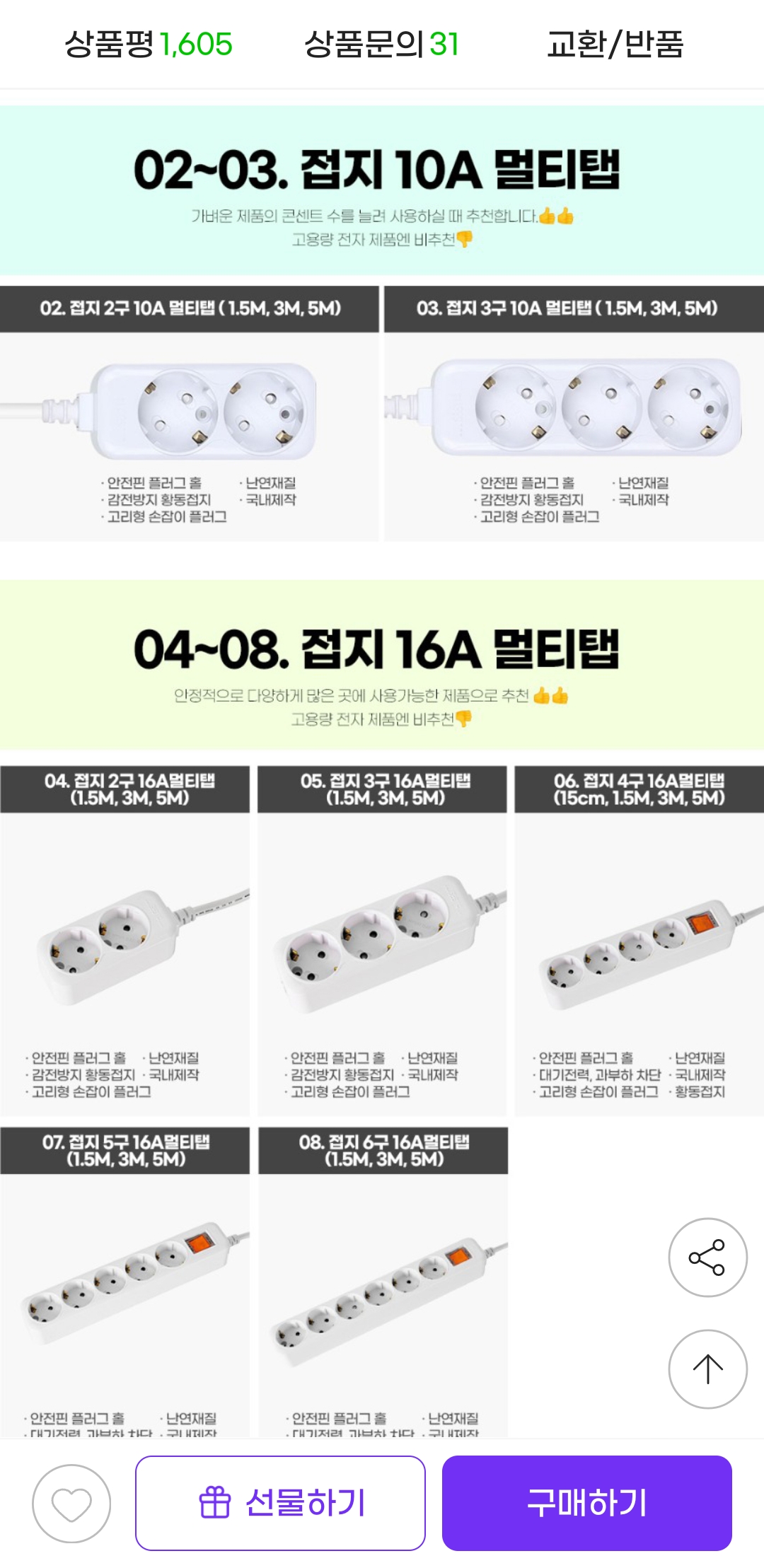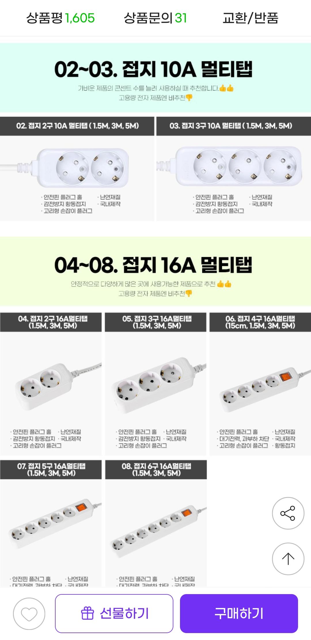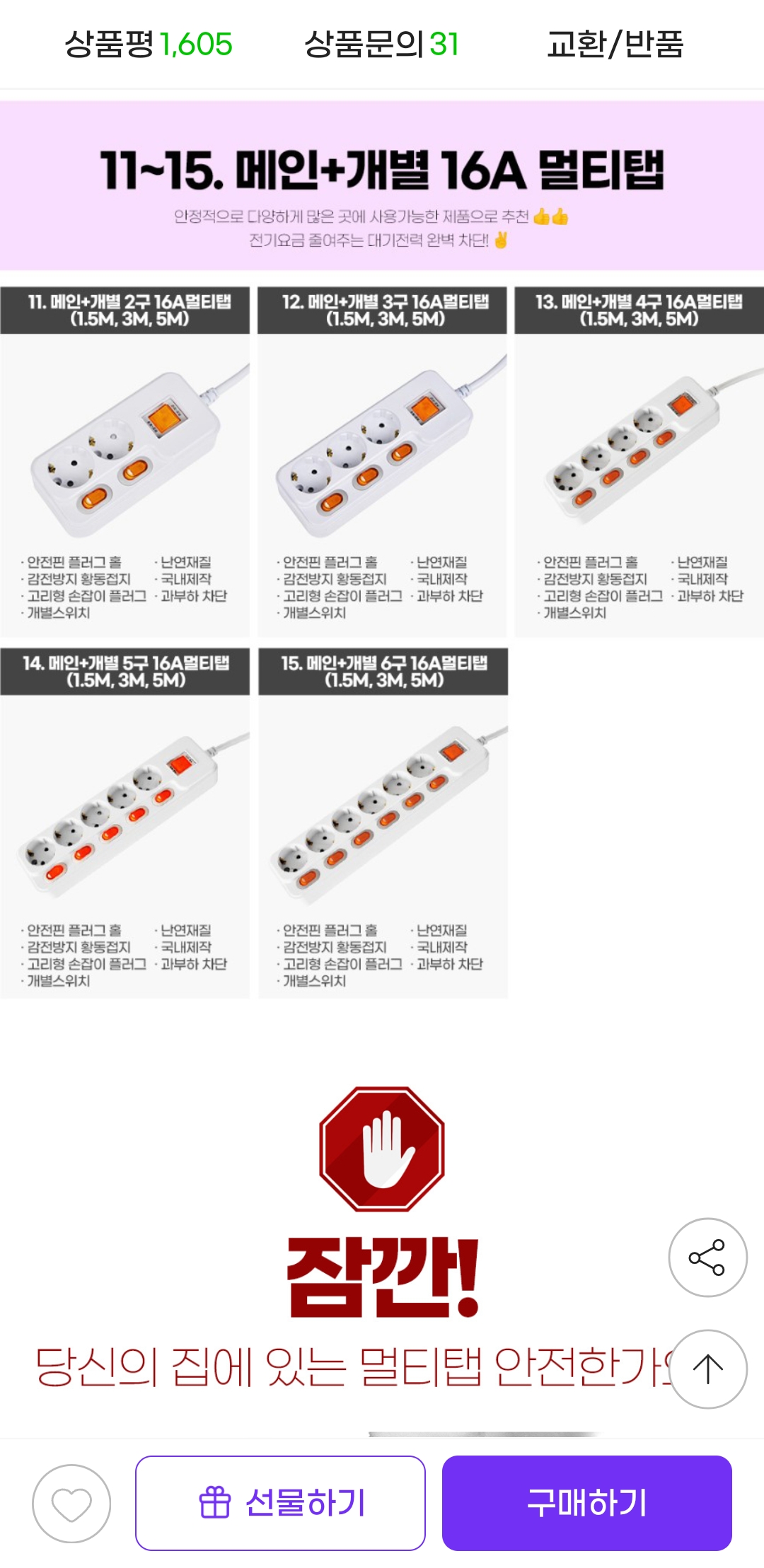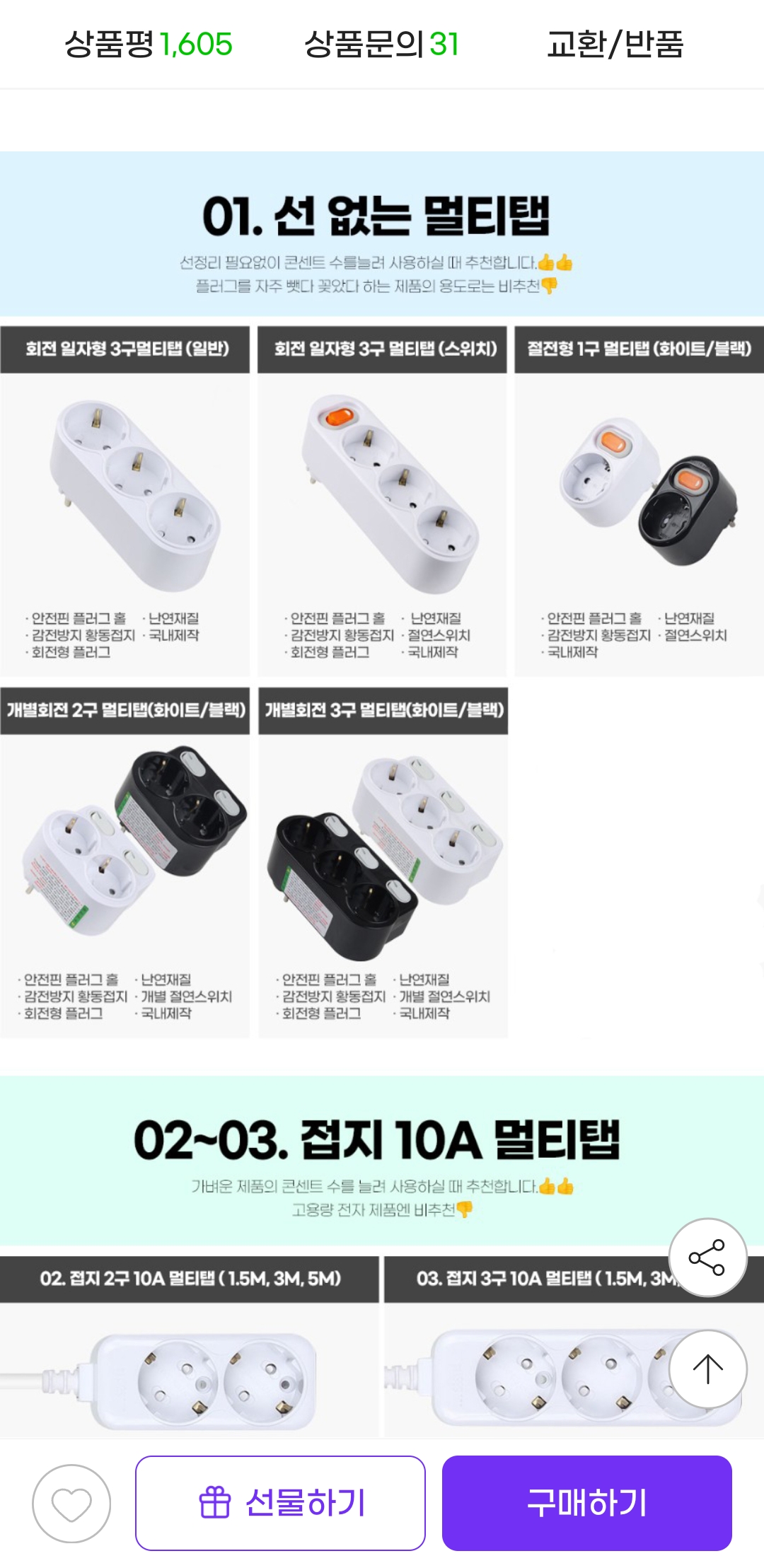 선없는 멀티탭, 2구, 3구, 4구, 5구, 6구 등 종류 진짜 많아요.