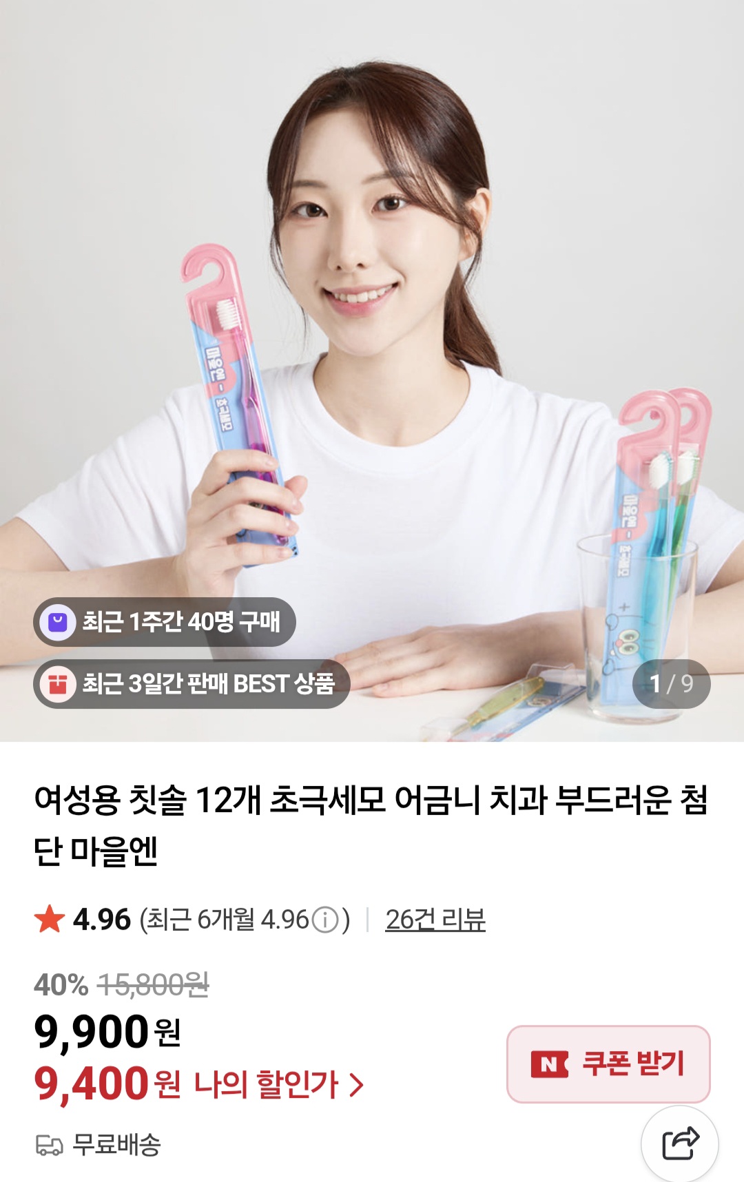 [네이버] 국산 초극세사모 칫솔 12개 (9,400원/무료)