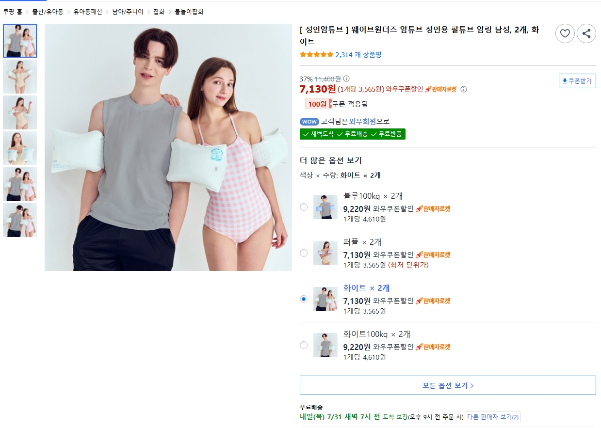 [쿠팡] 웨이브원더즈 암튜브 성인용 팔튜브 암링 남성, 2개, 화이트 (7,130원/무배)