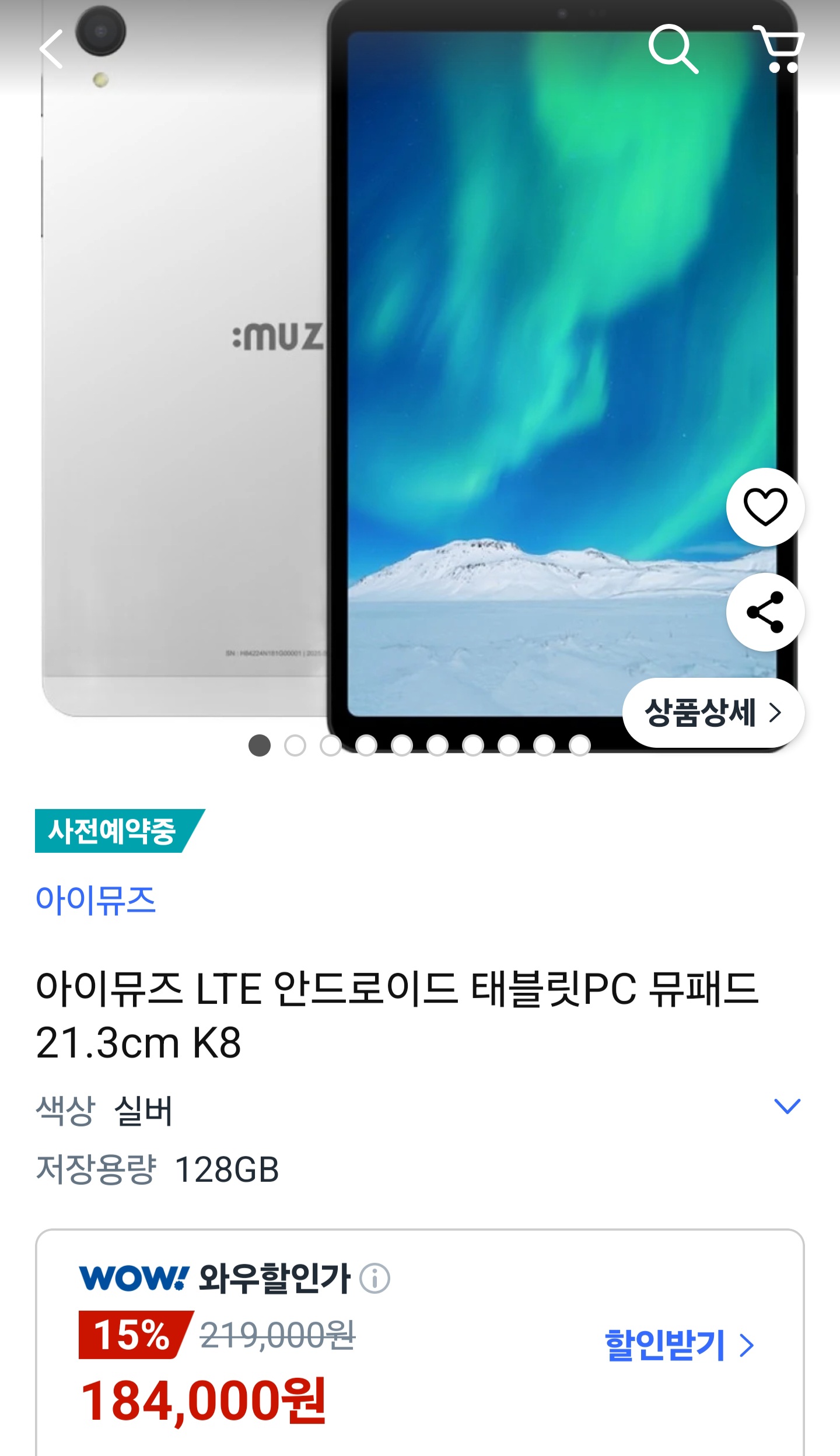 뮤패드 K8 8GB+128GB 실버색상 와우회원기준 184,000원 나와요