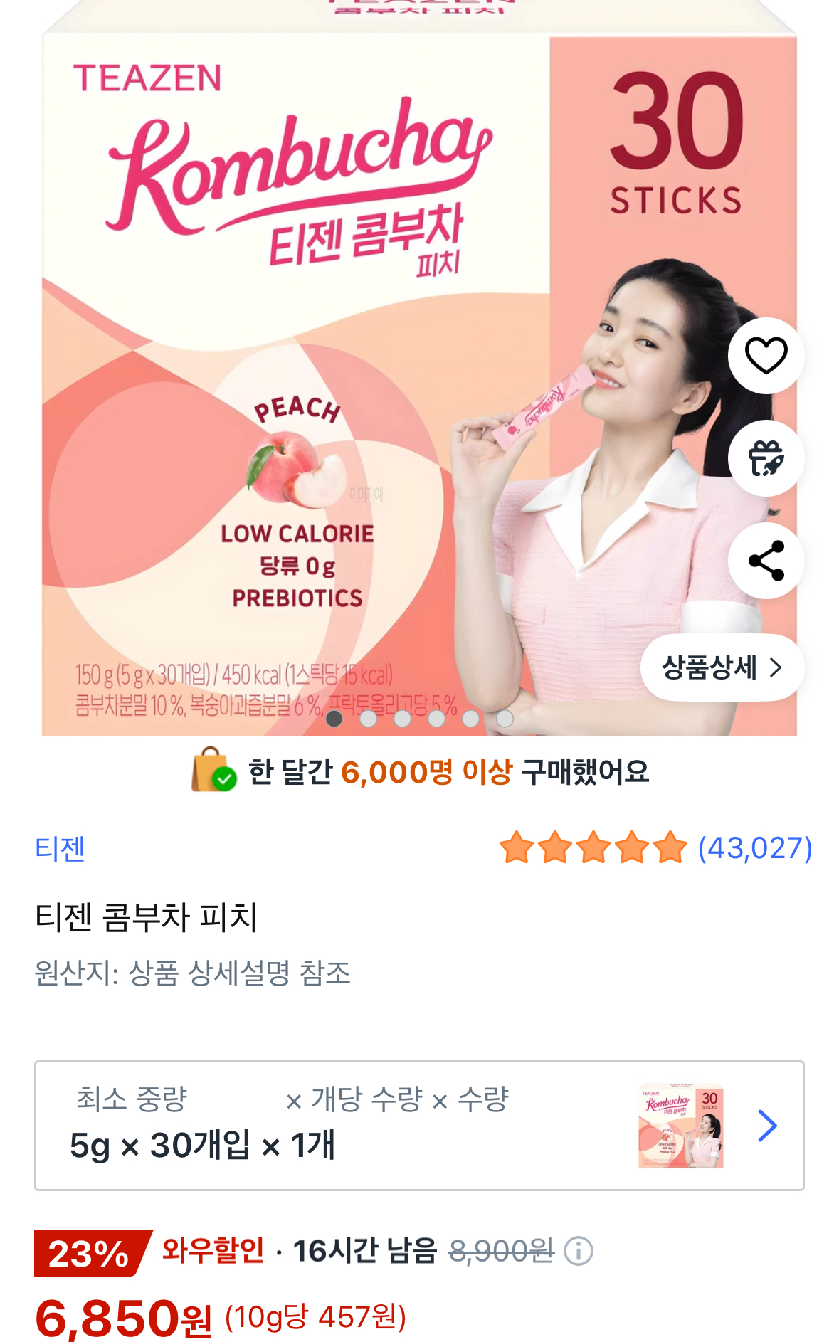 [쿠팡와우] 티젠 콤부차 피치 5g 30개 (6,850원/무료)