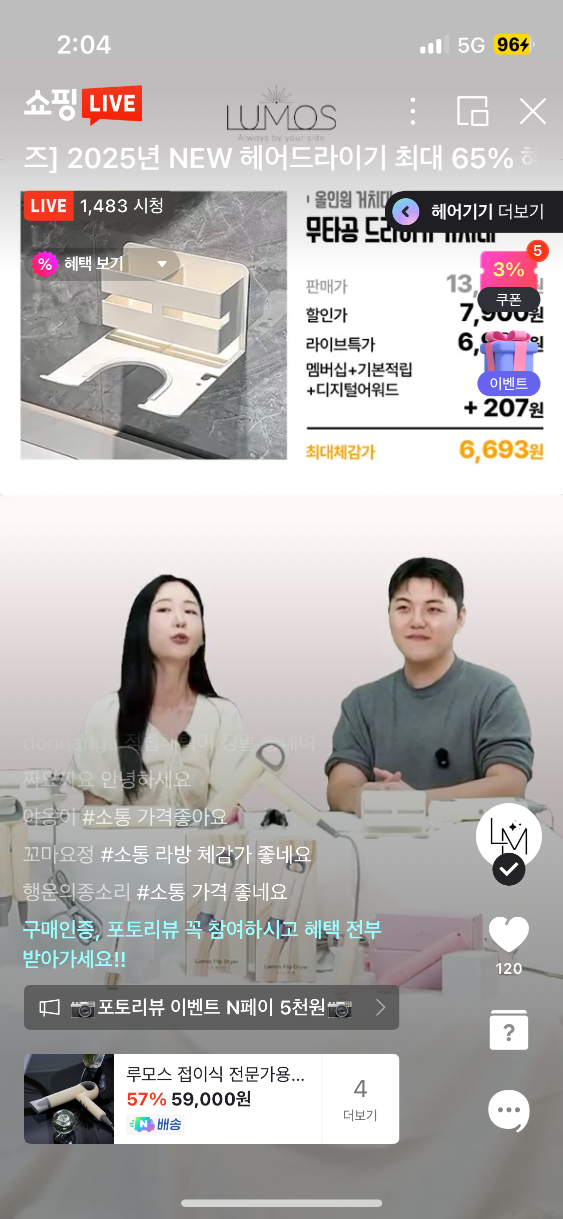 [네이버] 루모스 접이식 전문가용 드라이어 BLDC 모터 저소음 음이온 헤어 드라이기 (47,380원/무료)