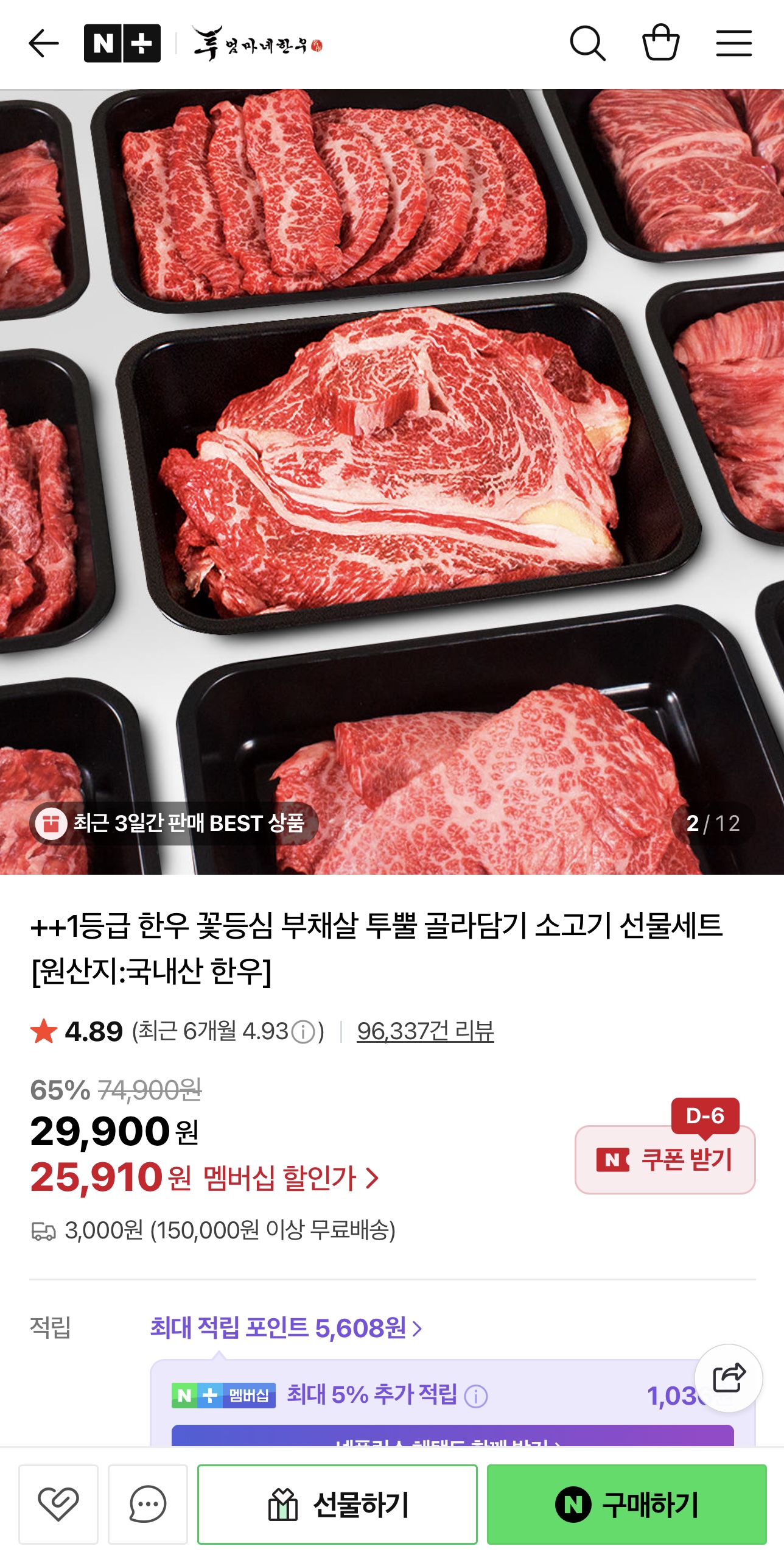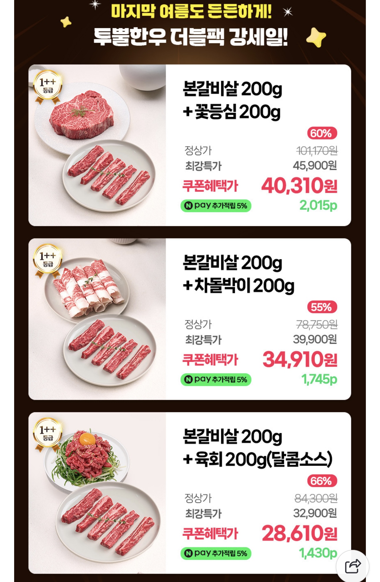 [네이버] 1++ 한우 본갈비살 200g + 꽃등심 200g (40,310원/무료)