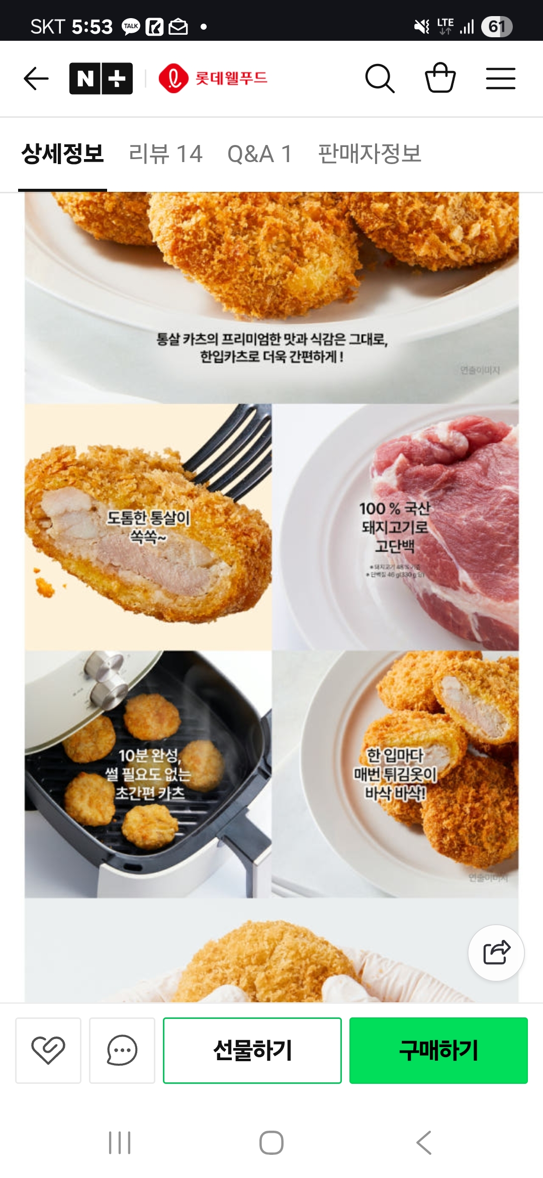 한입카츠라 에어프라이어에 돌려서 애들 주기도 좋고 100% 국내산 고기라 맛도 괜찮더라고요..