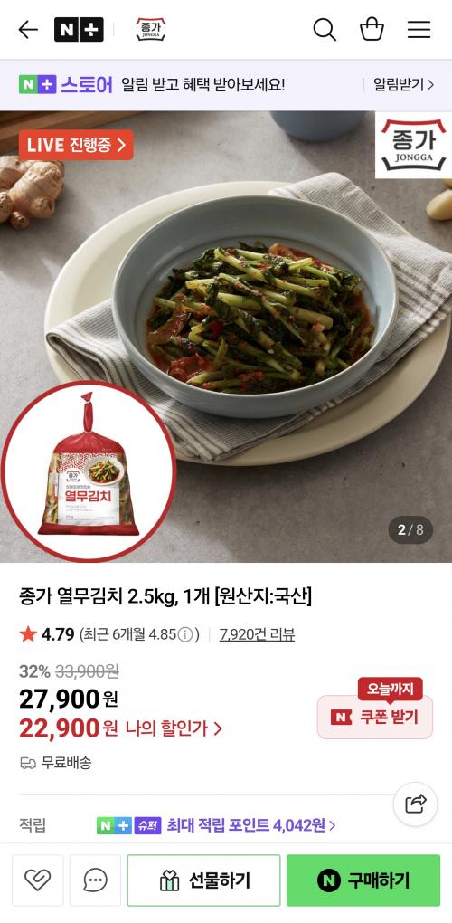 [네이버] 종가열무김치 2.5kg (22,900원/무료)