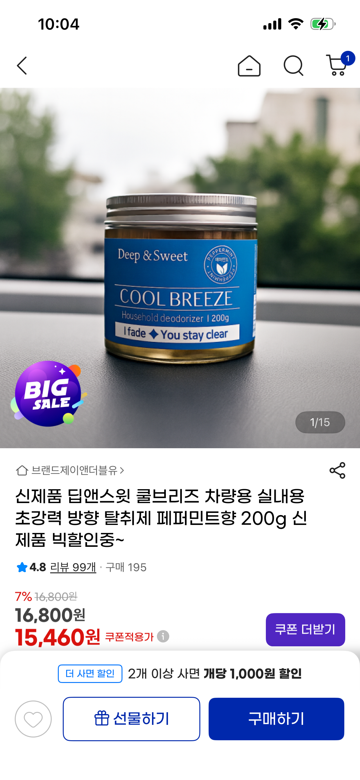 [지마켓] 딥앤스윗 쿨브리즈 페퍼민트향 방향탈취제 차량,실내용 (15,460원/무료)
