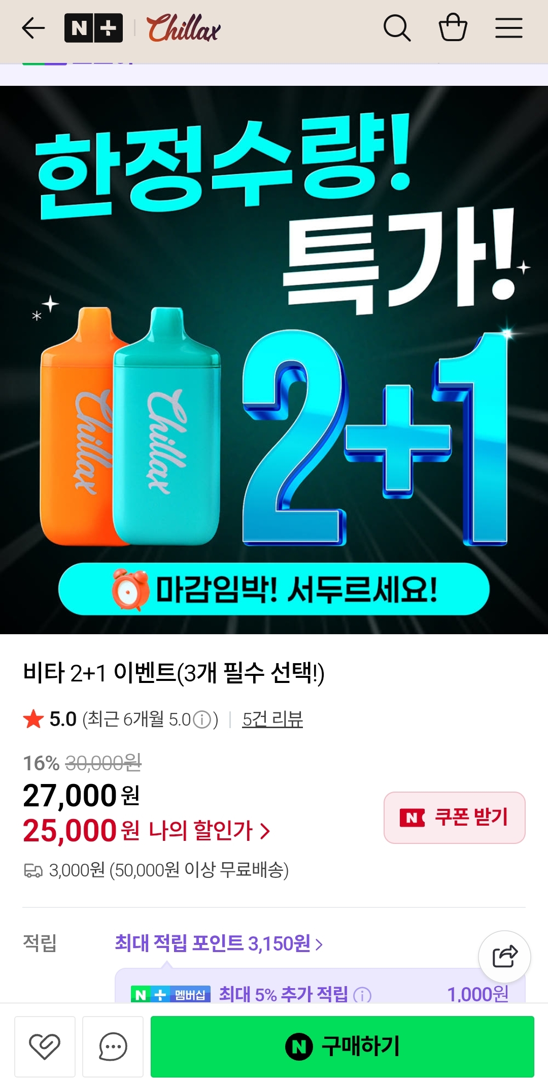 칠렉스 일회용 전자담배 2+1 (52,000원/무배)