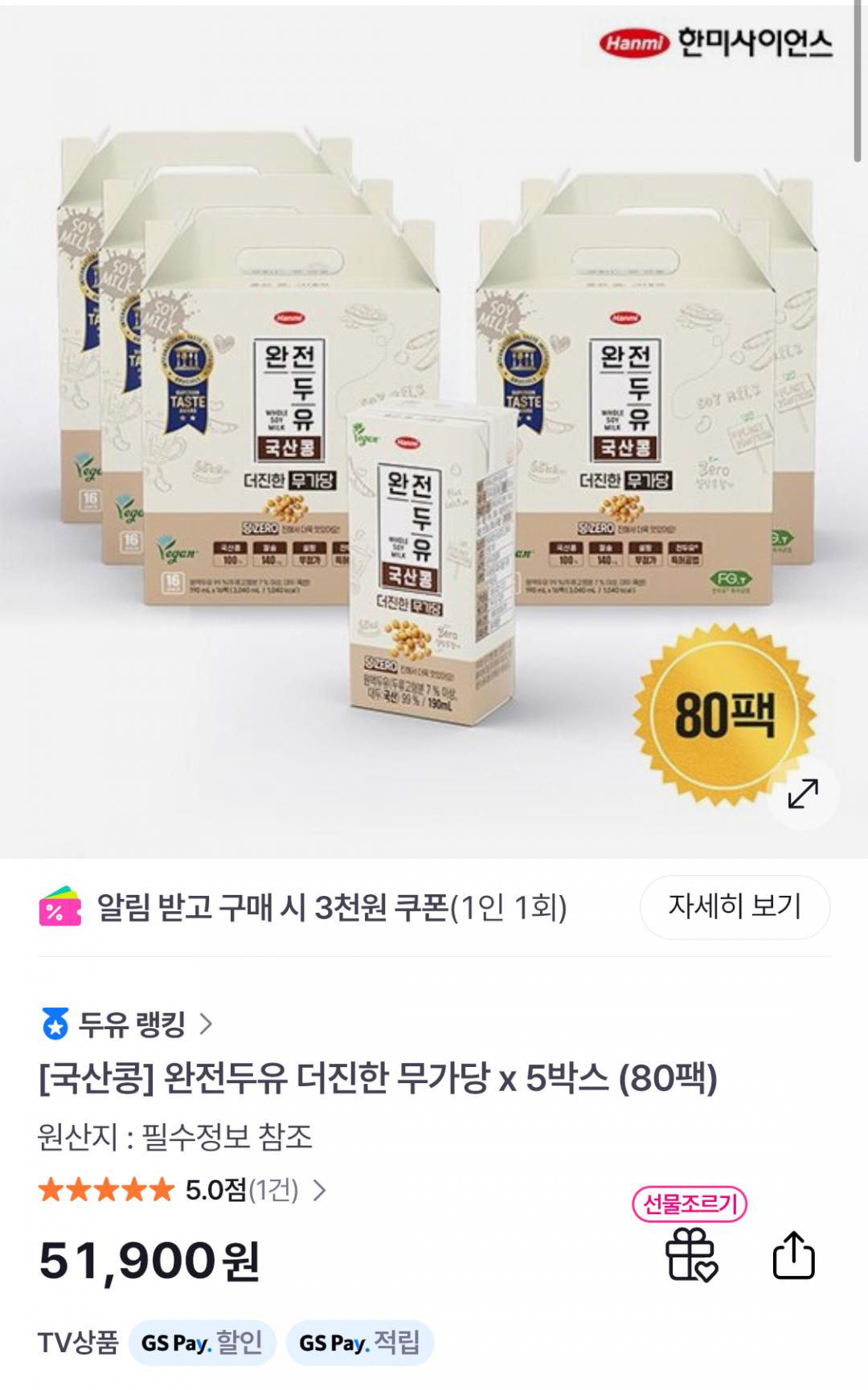 [GS샵] 완전두유 서리태 무가당 99.9 80팩 (49,900원/무료) > 국내핫딜
