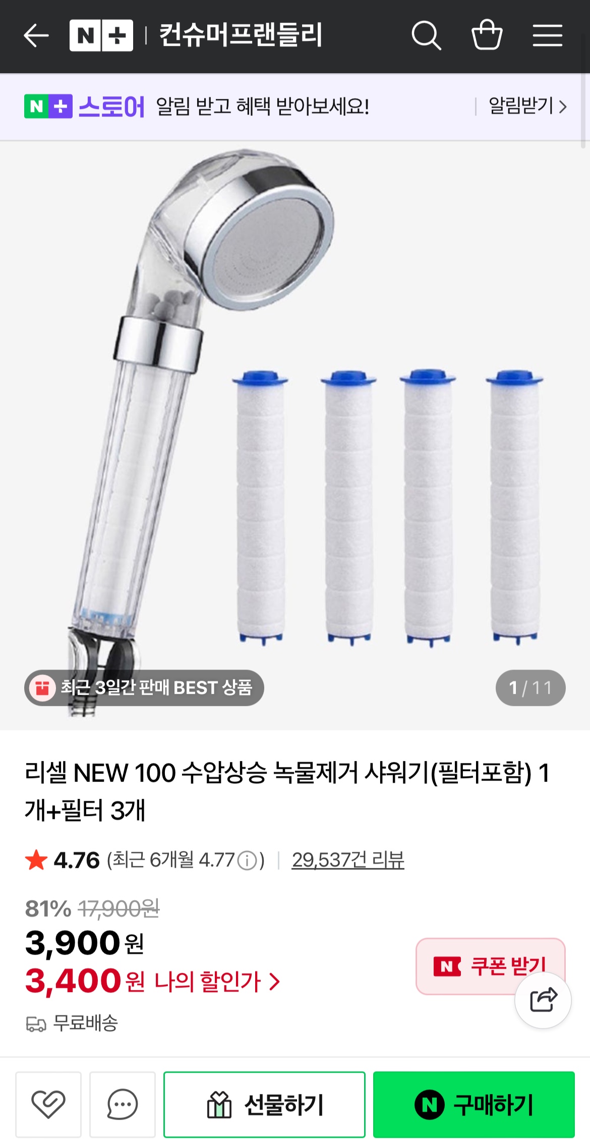 [네이버] 리셀 new 100 수압상승 녹물제거 샤워기(필터포함) + 필터 3개 (3,900원/무료)