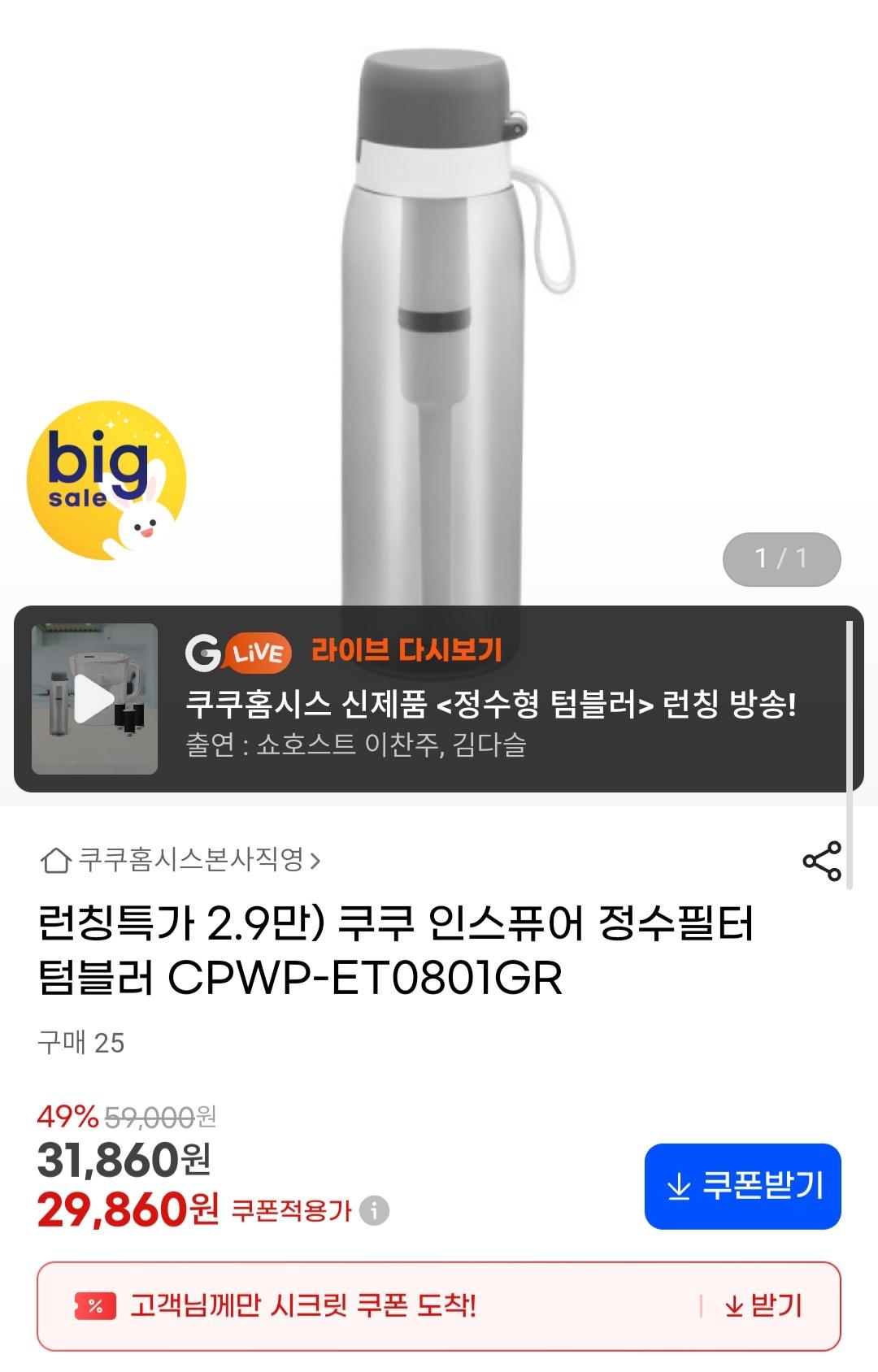 [지마켓] 쿠쿠 인스퓨어 정수필터정수기 (29,860원/무료)