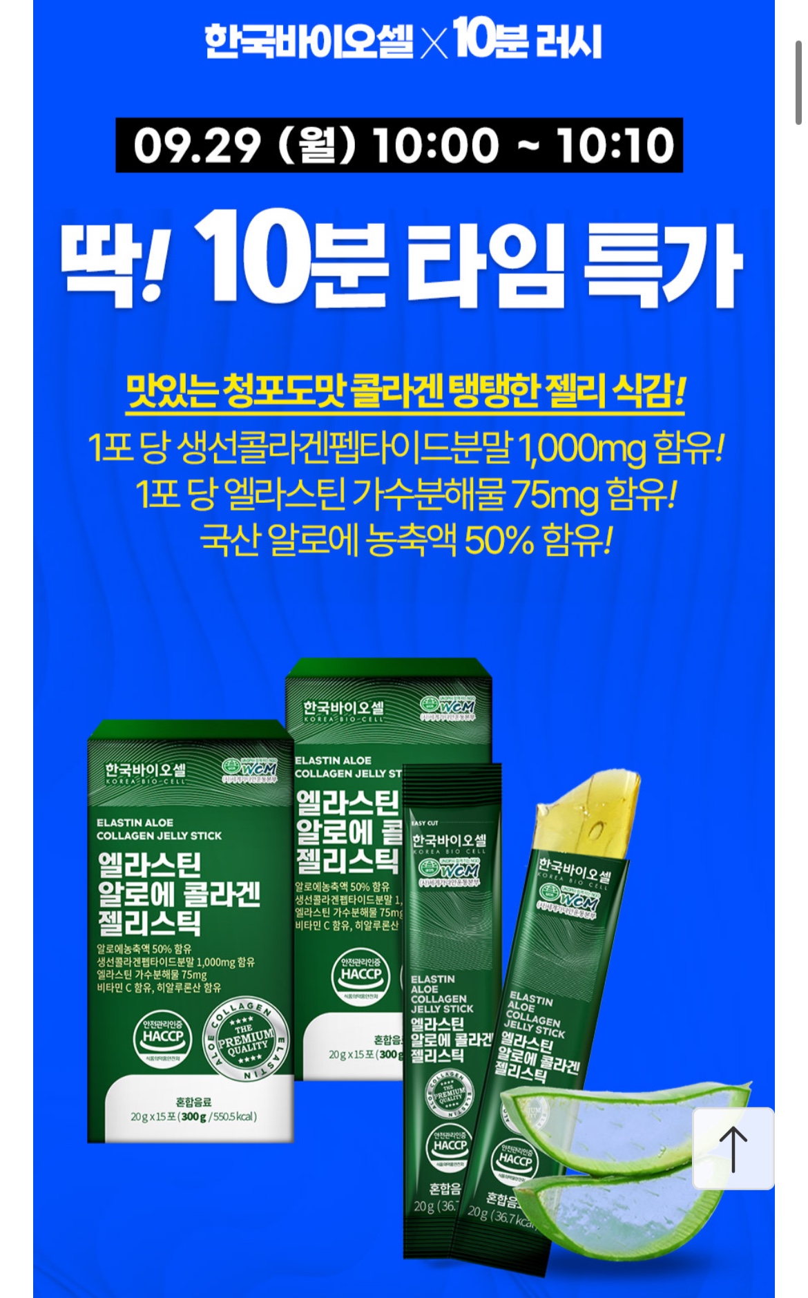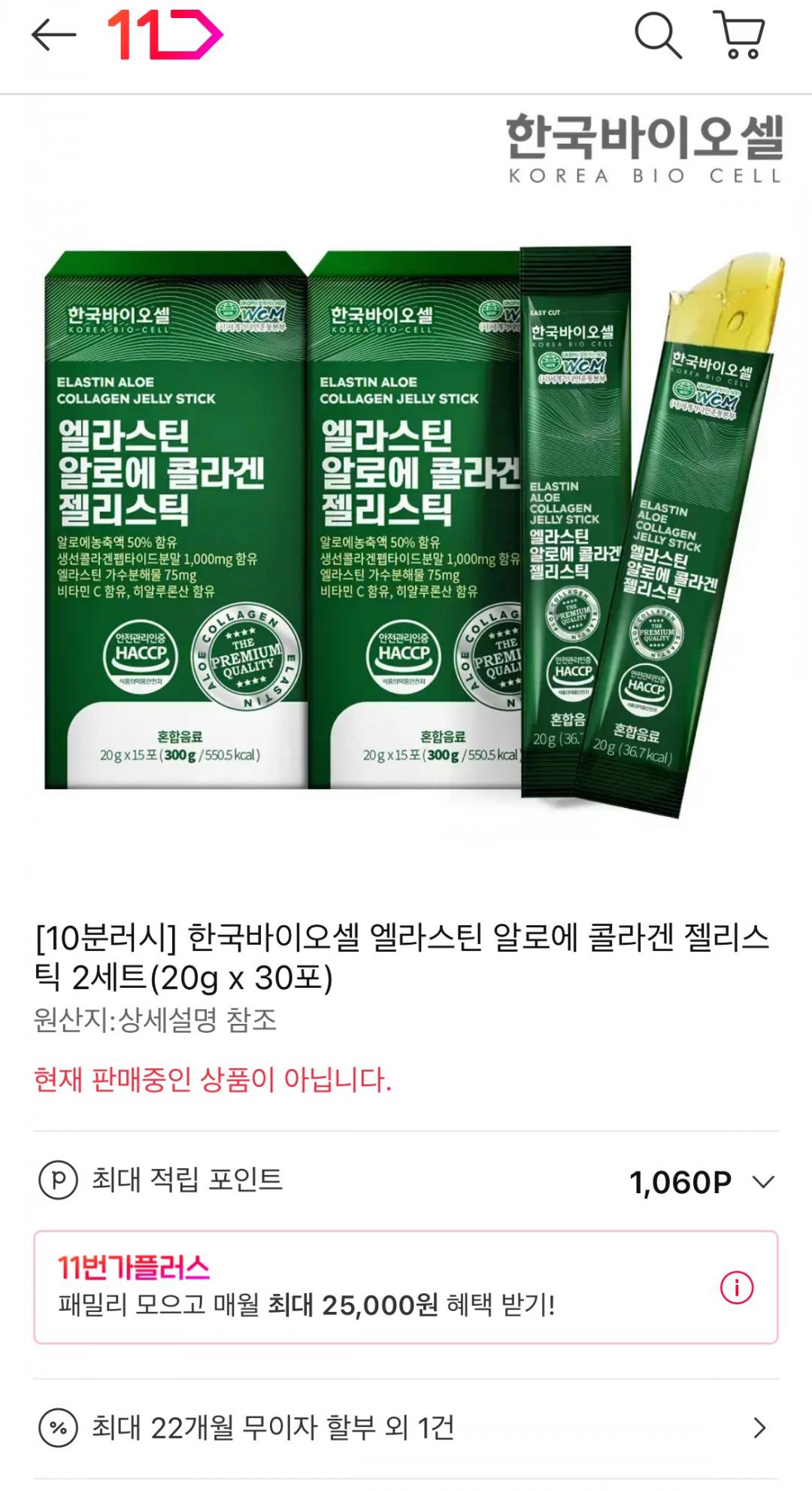 [11번가] 한국바이오셀 엘라스틴 알로에 콜라겐 젤리스틱 2세트(20g x 30포) (9,900원/무료) > 국내핫딜