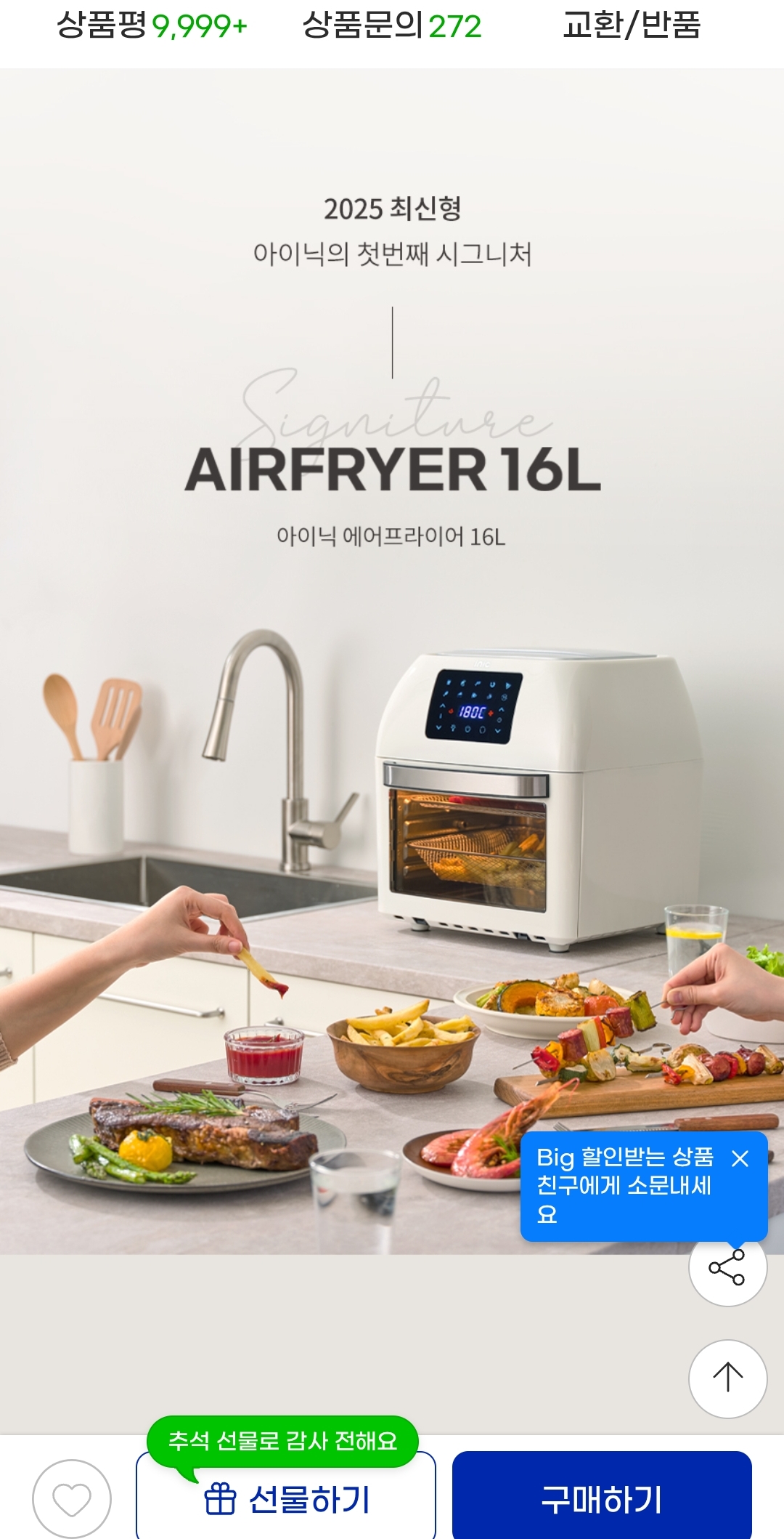 [지마켓] 아이닉 대용량 스텐 에어프라이어 AO-16L (128,400원 / 무배)