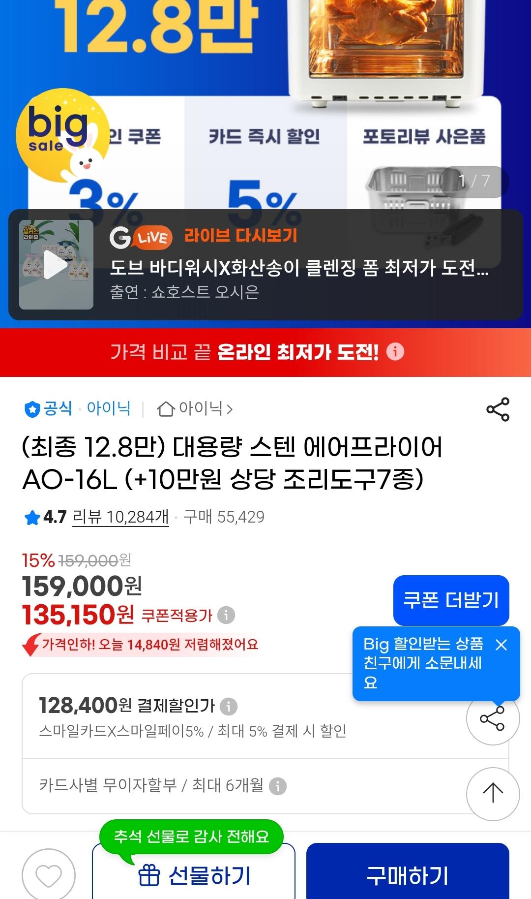 [지마켓] 아이닉 대용량 스텐 에어프라이어 AO-16L (128,400원 / 무배) > 국내핫딜