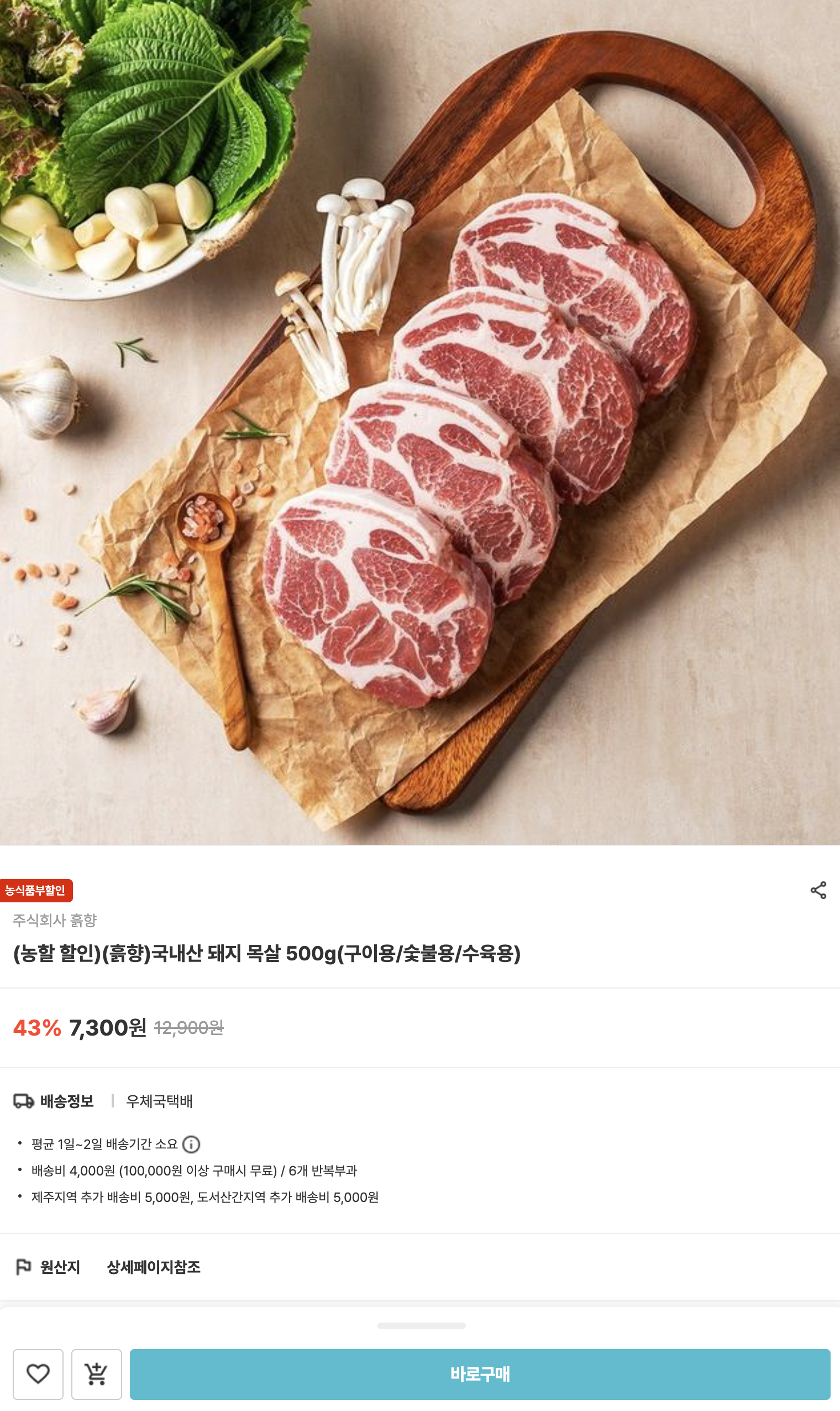 [남도장터] 국내산 목살 500g 핫딜 (7,300원/유배)