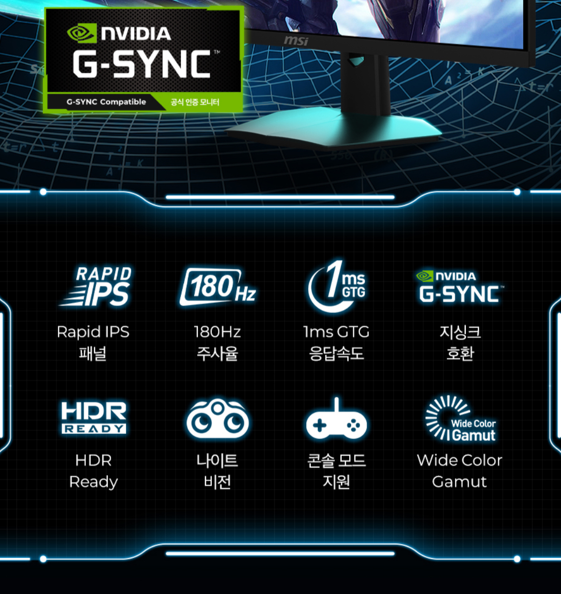 빠른 Rapid IPS, FHD, 180hz 고주사율, 반응속도 0.5ms 다갖춘 모니터이고