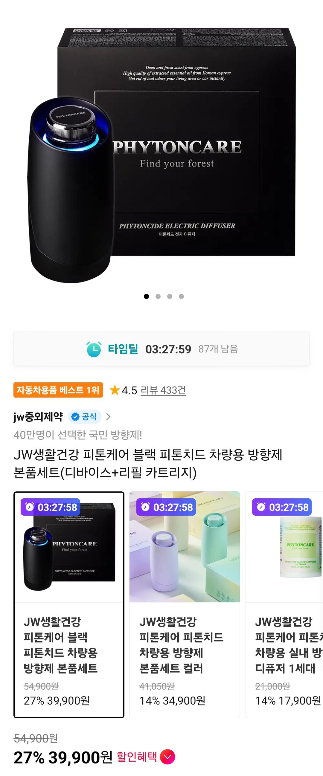 [11번가] JW생활건강 피톤케어 차량방향제 세트 (블랙/컬러3종) (34,900원/무배) > 국내핫딜