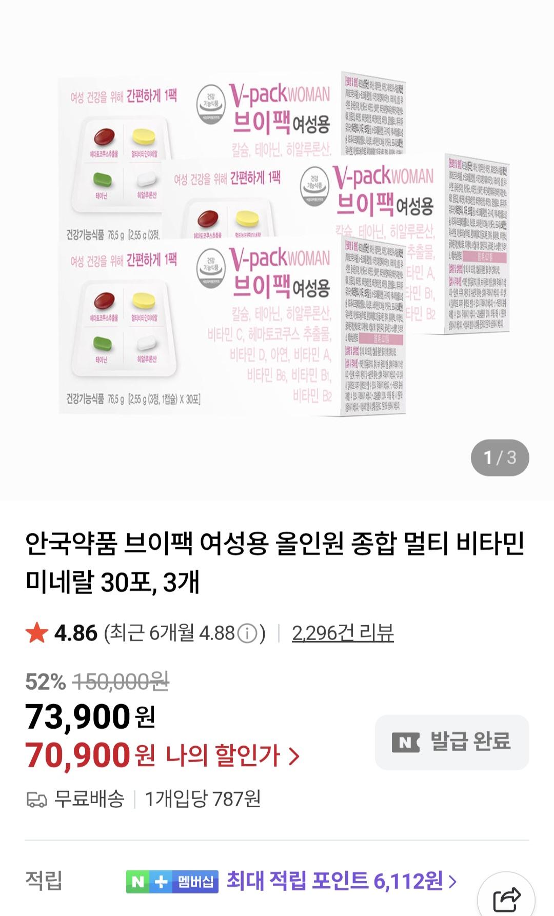 [네이버]안국약품 브이팩 여성용 올인원 종합 멀티 비타민미네랄 30포 3개+rtg오메가3 증정 (70,900 원/무배)