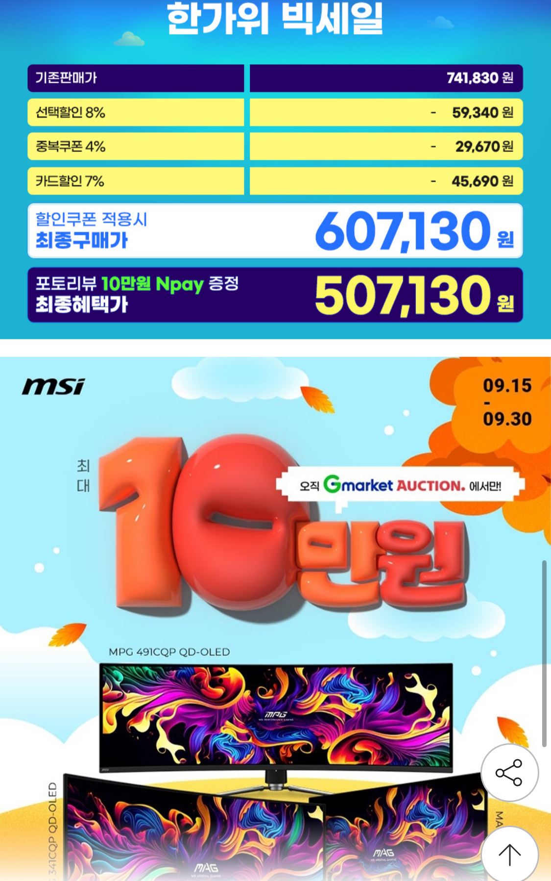 [G마켓] MSI MAG 271QPX QD-OLED E2 240 WQHD (607,130원/무배)