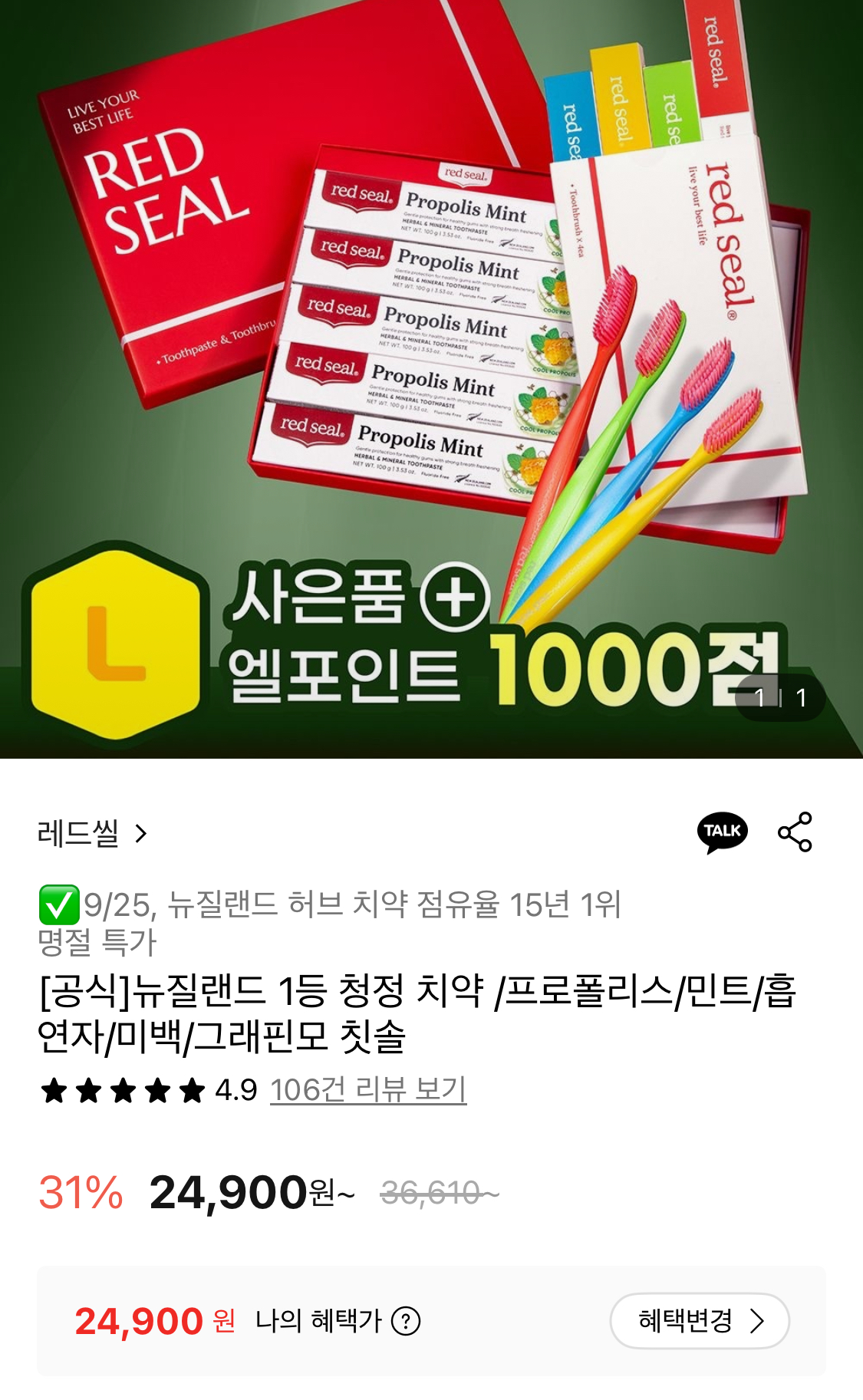 [롯데온] 레드씰 프로폴리스 민트치약 5개+칫솔 4개 선물세트 (24,900원/무료)