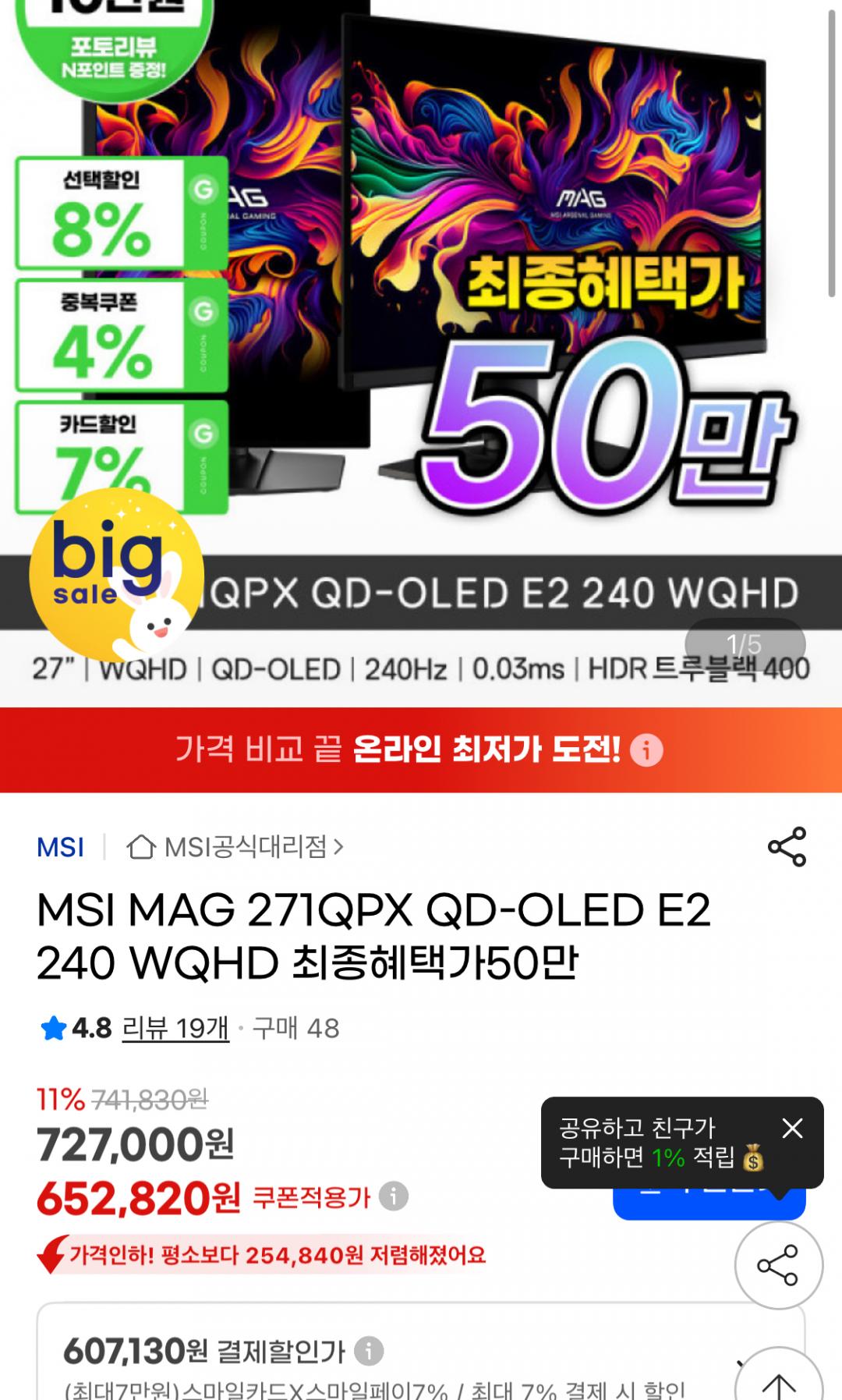 27인치 QD-OLED 끝판왕급 모니터가 60 초반입니다