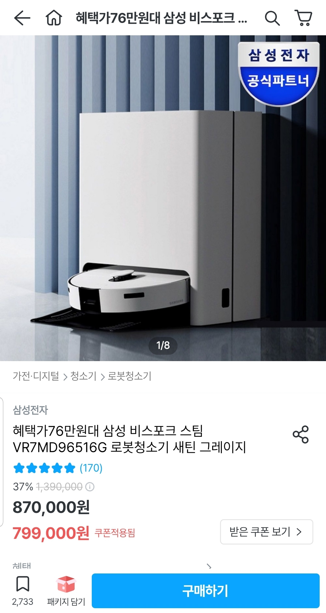 [오늘의집]삼성 비스포크 스팀 로봇청소기 (799,000원/무료)