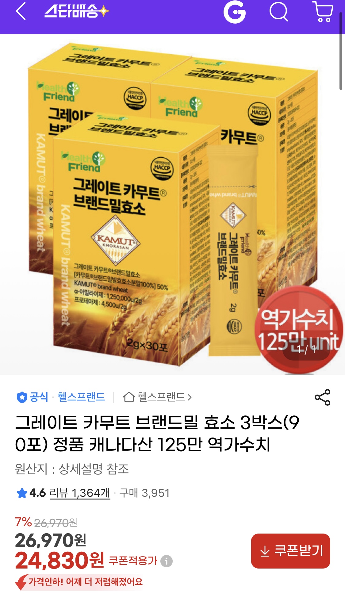 [지마켓] 그레이트 카무트 브랜드밀 효소 30포 x 3박스 (24,830원/무료)