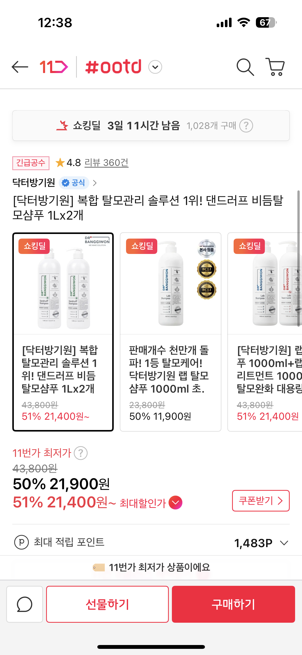 [11번가] [닥터방기원] 댄드러프 비듬탈모샴푸 1Lx2개 (21,400원/무배)