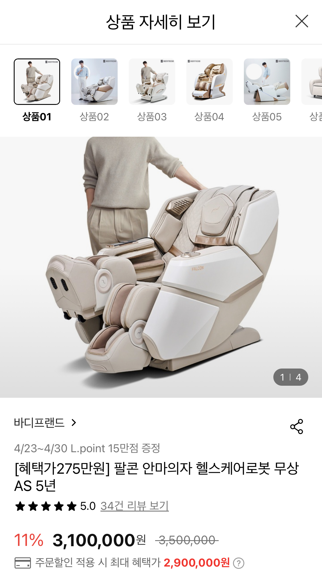 [롯데온] 바디프랜드 팔콘S 포인트 15만점 증정 (2,900,000원/무료) > 국내핫딜